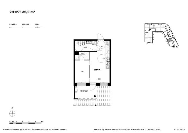 Etusivu / Varsinais-Suomi / Turku / Konsantie 1 1 / 1 Konsantie 1 Raunistula, Turku | Kerrostalo | 2h, avok, vh, et, kph, terassi 175 900 € Velaton hinta 36,0 m2 Asuinpinta-ala 140,40 €/kk Hoitovastike 2027 Rakennusvuosi HYÖDYNNÄ HUIPPUETU! Varaa asunto helposti ilman varausmaksua. Kauppakirjojen allekirjoituksen yhteydessä maksat myyntihinnasta vain 15 % ja loput vasta kodin valmistuessa (arvioitu valmistumisaika vuoden 2027 aikana).Raunistulan Idylli Modernia asumista Turun sydämessäRaunistulan Idylli yhdistää viehättävän puutaloalueen rauhan modernin asumisen mukavuuksiin. Asunnoissa on suuret ikkunat ja toimivat pohjaratkaisut. Tämä nelikerroksinen kerrostalo kohoaa Raunistulan sydämeen, vain lyhyen matkan päähän Turun keskustasta. Arvioitu valmistuminen vuoden 2027 aikana. Tämä näppärä kaksio tarjoaa toimivaa arkea ja rivitalomaista asumista. Asunnossa on oma sisäpihalle avautuva lauta- ja kivetyspintainen terassi, jossa suojaa antavat pergola ja köynnöskasvit. Terassilta on myös oma erillinen sisäänkäynti. Varaus viilentävälle ilmalämpöpumpulle. Idyllin asunnot sopivat niin yksinasuville, pariskunnille kuin pienille perheillekin. Tarjolla on myös muun muassa loft-tyylisiä koteja, joissa huonekorkeus kohoaa jopa neljään metriin ja nukkumaparvella on yli puolitoista metriä korkeutta. Ensimmäisen kerroksen asunnoissa on oma sisäänkäynti omalta pikkupihalta. Idyllissä arki sujuu ilman remonttihuolia tai pihatöitä. Taloyhtiöllä on vehreä ja viihtyisä piha, oma pihasauna, yhteinen kuntoilutila, pyörävarasto pesupaikkoineen sekä sähköautojen latausmahdollisuus. Asunnoissa on varaus ilmalämpöpumpulle ja taloyhtiössä varaudutaan aurinkopaneeleihin. Energiatehokkuus ja vastuulliset asumisratkaisut varmistavat kestävän ja miellyttävän asumisen.Raunistula on viehättävä puutalopainotteinen asuinalue vain 2 km päässä Turun keskustasta, rautatieasemalta ja Turun yliopistosta. Logomo sekä suunnitteilla oleva uusi Turun Ratapihan elämyskeskus ja areena tulevat sijaitsemaan vain kävelymatkan etäisyydellä.Kohde ennakkomarkkinoinnissa, kerromme mielellämme lisätietoja! Kohteen rakennuttamisesta vastaa SRV, joka on luotettava ja vakavarainen toimija. Myynti ja esittelyt/Miika Salmelap. 0500 533 582miika.salmela@bo.fijaSaija Palinp. 040 756 7070saija.palin@bo.fijaTAINA VUORIp. 050 527 4106taina.vuori@bo.fi Kiinnostaako tämä kohde?Ota meihin yhteyttä tai jätä viesti Miika Salmela asuntomyyjä, partner 0500 533 582 miika.salmela@bo.fi Tutustu välittäjään HuoneistoOsakkeet1206-1565HallintamuotoAsunto-osakeyhtiöHuoneluku2h, avok, vh, et, kph, terassiKerros/Kerroksia1/4Asuinpinta-ala36,0 m2Muut tilat0,0 m2Lisätietoja pinta-alastaPinta-ala ei ole tarkistusmitattuNäkymätHuoneistoilla on parvekkeet pohjapiirustusten mukaisesti. Lattia, katto ja seinät ovat betonirakenteisia. Parvekekaiteet ovat pääosin lasikaiteita. Asuntoparvekkeet ovat pääosin lasitettuja. Parvekkeet ovat ulkotiloja. Osassa parvekepielistä on asennettu varatieluukku, joka toimii poistumisreittinä hätätilanteessa. Osassa 1. kerroksen asunnoista on maantasoterassit. Maantasoterasseja ei lasiteta. Maantasoterasseilla on terassilaudoitus. HissiTaloyhtiössä on hissiKeittiön kuvaus, lisätiedot ja varustusKeittiökalusteiden ovet ja etusarjat ovat tehtaan vakiomallistoa. Kodinkoneet (Electrolux). KEITTOTASO: Induktiotaso 60 cm. KEITTOTASO: Induktiotaso 60 cm. KALUSTEUUNI: Teräs tai valkoinen 60 cm. MIKROAALTOUUNI: Valkoinen tai musta 60 cm. ASTIANPESUKONE: Astianpesukone 60 cm, kalustepeitteinen, ovi keittiön mukaan. JÄÄKAAPPI: Jääkaappi, vapaasti seisova, valkoinen/teräs. Kaappipakastin, vapaasti seisova, valkoinen/teräs. Jääkaappipakastin, vapaasti seisova, valkoinen/teräs. LIESIKUPU: Vallox Delico, valkoinen tai musta. KEITTIÖHANA: Oras Safira 1039F. PESUALLAS: Teräs tai musta, 40 tai 50 cm KEITTIÖN VÄLITILAVALAISIN: Kalustetoimittajan integroima LED-nauhavalaisin, 4000 K. Rakennuttajan puolelta on valmiiksi koottuna kolme eri tyylistä sisustusteemaa: Talvi, Kesä ja Syksy. Teemoja voi yhdistellä vapaasti keskenään. TALVI: KALUSTEOVI: Mattavalkoinen melamiiniovi. VEDIN: Yläovi, vetimetön. Alaovi ja korkeat komerot, RST lippavedin. KALUSTESOKKELI: Valkoinen, ei jalkalistaa keittiökalusteen eteen. TYÖTASO: Musta tai harmaa laminaattitaso. VÄLITILA: Valkoinen välitilalevy. KESÄ: KALUSTEOVI: Tammen sävyinen puukuvioinen melamiiniovi. VEDIN: Yläovi, vetimetön. Alaovi ja korkeat komerot, RST vedin. KALUSTESOKKELI: Valkoinen, ei jalkalistaa keittiökalusteen eteen. TYÖTASO: Marmorikuvioinen laminaattitaso. VÄLITILA: Valkoinen välitilalevy. SYKSY: KALUSTEOVI: Musta melamiiniovi, puusyykuvio. VEDIN: Yläovi, vetimetön. Alaovi ja korkeat komerot, messinkivedin. KALUSTESOKKELI: Valkoinen, ei jalkalistaa keittiökalusteen eteen. TYÖTASO: Marmorikuvioinen laminaattitaso.Pesutilojen kuvaus, lisätiedot ja varustusPesuhuoneessa on pyykinpesukoneliitäntä, varaus pesutornille, allas, allaskaluste ja sen yläpuolella valaisinpeilikaappi. Kalusteet ovat kalustelevyä. Suihkuseinä on pohjapiirrokseen merkityssä kohdassa. Suihkuseinien mitoitus on huoneistokohtaisten märkätilakaavioiden mukaan. Laatat: Laattapiste. PEILIKAAPPI: Svedbergs valkoinen peilikaappi LED-valolla 60 cm tai 80 cm. ALLAS JA ALLASKALUSTE: Svedbergs valkoinen posliiniallas ja valkoinen allaskaappi kahdella laatikolla 60 cm tai 80 cm. PESUALLASHANA: Oras Safira ECO 1012F-105, kromi, bidetta käsisuihkulla. SUIHKUHANA: Oras. Termostaattirunko 7462G kiinteällä juoksuputkella + Apollo- suihkusetti 548, kromi. WC-ISTUIN: Gustavsberg Nautic HF 1500, kova istuinkansi. PYYKKIKAAPPI: Svedbergs. Osassa asunnoista korkea pyykkikaappi kahdella pyykkikorilla huoneistopohjien mukaisesti. SUIHKUSEINÄ: Vihtan Ocean 3, kirkas lasi, alumiinirunko tai vastaava kylpyhuonekaavion mukaan. LATTIAKAIVON KANSI: Vieser Classic, RST. KOUKUSTOT: Cello Spa Kaksoiskoukku, kromi. Ne