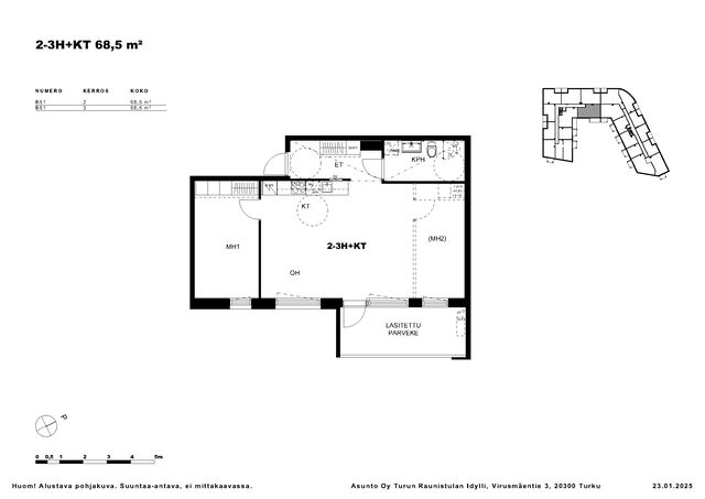 Etusivu / Varsinais-Suomi / Turku / Konsantie 1 1 / 1 Konsantie 1 Raunistula, Turku | Kerrostalo | 2-3h, avok, kph, et, lasit.p 285 900 € Velaton hinta 68,5 m2 Asuinpinta-ala 267,15 €/kk Hoitovastike 2027 Rakennusvuosi HYÖDYNNÄ HUIPPUETU! Varaa asunto helposti ilman varausmaksua. Kauppakirjojen allekirjoituksen yhteydessä maksat myyntihinnasta vain 15 % ja loput vasta kodin valmistuessa (arvioitu valmistumisaika vuoden 2027 aikana).Raunistulan Idylli Modernia asumista Turun sydämessäRaunistulan Idylli yhdistää viehättävän puutaloalueen rauhan modernin asumisen mukavuuksiin. Asunnoissa on suuret ikkunat ja toimivat pohjaratkaisut. Tämä nelikerroksinen kerrostalo kohoaa Raunistulan sydämeen, vain lyhyen matkan päähän Turun keskustasta. Arvioitu valmistuminen vuoden 2027 aikana. Tämä tilava huoneisto tarjoaa sujuvaa arkea, ja sitä on mahdollista muokata juuri sinun tarpeisiisi sopivaksi. Voit lisätä kotiisi helposti yhden huoneen rakentamisen aikana tai sen jälkeen. Moderni ja selkeäpohjainen tila on helppo sisustaa juuri omien mieltymystesi mukaan. Olohuone yhdistyy luontevasti keittiöön luoden viihtyisän ja valoisan tilan yhdessäoloon tai rentoutumiseen pitkän päivän jälkeen. Erillinen eteistila lisää arjen sujuvuutta. Sisäpihalle avautuva lasitettu parveke toimii ympäri vuoden viihtyisänä oleskelupaikkana. Asunnossa on varaus viilentävälle ilmalämpöpumpulle.Idyllin asunnot sopivat niin yksinasuville, pariskunnille kuin pienille perheillekin. Tarjolla on myös muun muassa loft-tyylisiä koteja, joissa huonekorkeus kohoaa jopa neljään metriin ja nukkumaparvella on yli puolitoista metriä korkeutta. Ensimmäisen kerroksen asunnoissa on oma sisäänkäynti omalta pikkupihalta. Idyllissä arki sujuu ilman remonttihuolia tai pihatöitä. Taloyhtiöllä on vehreä ja viihtyisä piha, oma pihasauna, yhteinen kuntoilutila, pyörävarasto pesupaikkoineen sekä sähköautojen latausmahdollisuus. Asunnoissa on varaus ilmalämpöpumpulle ja taloyhtiössä varaudutaan aurinkopaneeleihin. Energiatehokkuus ja vastuulliset asumisratkaisut varmistavat kestävän ja miellyttävän asumisen.Raunistula on viehättävä puutalopainotteinen asuinalue vain 2 km päässä Turun keskustasta, rautatieasemalta ja Turun yliopistosta. Logomo sekä suunnitteilla oleva uusi Turun Ratapihan elämyskeskus ja areena tulevat sijaitsemaan vain kävelymatkan etäisyydellä.Kohde ennakkomarkkinoinnissa, kerromme mielellämme lisätietoja! Kohteen rakennuttamisesta vastaa SRV, joka on luotettava ja vakavarainen toimija. Myynti ja esittelyt/Miika Salmelap. 0500 533 582miika.salmela@bo.fijaSaija Palinp. 040 756 7070saija.palin@bo.fijaTAINA VUORIp. 050 527 4106taina.vuori@bo.fi Kiinnostaako tämä kohde?Ota meihin yhteyttä tai jätä viesti Miika Salmela asuntomyyjä, partner 0500 533 582 miika.salmela@bo.fi Tutustu välittäjään HuoneistoOsakkeet16251-16935HallintamuotoAsunto-osakeyhtiöHuoneluku2-3h, avok, kph, et, lasit.pKerros/Kerroksia2/4Asuinpinta-ala68,5 m2Muut tilat0,0 m2Lisätietoja pinta-alastaPinta-ala ei ole tarkistusmitattuNäkymätHuoneistoilla on parvekkeet pohjapiirustusten mukaisesti. Lattia, katto ja seinät ovat betonirakenteisia. Parvekekaiteet ovat pääosin lasikaiteita. Asuntoparvekkeet ovat pääosin lasitettuja. Parvekkeet ovat ulkotiloja. Osassa parvekepielistä on asennettu varatieluukku, joka toimii poistumisreittinä hätätilanteessa. Osassa 1. kerroksen asunnoista on maantasoterassit. Maantasoterasseja ei lasiteta. Maantasoterasseilla on terassilaudoitus. ParvekeLasitettuHissiTaloyhtiössä on hissiKeittiön kuvaus, lisätiedot ja varustusKeittiökalusteiden ovet ja etusarjat ovat tehtaan vakiomallistoa. Kodinkoneet (Electrolux). KEITTOTASO: Induktiotaso 60 cm. KEITTOTASO: Induktiotaso 60 cm. KALUSTEUUNI: Teräs tai valkoinen 60 cm. MIKROAALTOUUNI: Valkoinen tai musta 60 cm. ASTIANPESUKONE: Astianpesukone 60 cm, kalustepeitteinen, ovi keittiön mukaan. JÄÄKAAPPI: Jääkaappi, vapaasti seisova, valkoinen/teräs. Kaappipakastin, vapaasti seisova, valkoinen/teräs. Jääkaappipakastin, vapaasti seisova, valkoinen/teräs. LIESIKUPU: Vallox Delico, valkoinen tai musta. KEITTIÖHANA: Oras Safira 1039F. PESUALLAS: Teräs tai musta, 40 tai 50 cm KEITTIÖN VÄLITILAVALAISIN: Kalustetoimittajan integroima LED-nauhavalaisin, 4000 K. Rakennuttajan puolelta on valmiiksi koottuna kolme eri tyylistä sisustusteemaa: Talvi, Kesä ja Syksy. Teemoja voi yhdistellä vapaasti keskenään. TALVI: KALUSTEOVI: Mattavalkoinen melamiiniovi. VEDIN: Yläovi, vetimetön. Alaovi ja korkeat komerot, RST lippavedin. KALUSTESOKKELI: Valkoinen, ei jalkalistaa keittiökalusteen eteen. TYÖTASO: Musta tai harmaa laminaattitaso. VÄLITILA: Valkoinen välitilalevy. KESÄ: KALUSTEOVI: Tammen sävyinen puukuvioinen melamiiniovi. VEDIN: Yläovi, vetimetön. Alaovi ja korkeat komerot, RST vedin. KALUSTESOKKELI: Valkoinen, ei jalkalistaa keittiökalusteen eteen. TYÖTASO: Marmorikuvioinen laminaattitaso. VÄLITILA: Valkoinen välitilalevy. SYKSY: KALUSTEOVI: Musta melamiiniovi, puusyykuvio. VEDIN: Yläovi, vetimetön. Alaovi ja korkeat komerot, messinkivedin. KALUSTESOKKELI: Valkoinen, ei jalkalistaa keittiökalusteen eteen. TYÖTASO: Marmorikuvioinen laminaattitaso.Pesutilojen kuvaus, lisätiedot ja varustusPesuhuoneessa on pyykinpesukoneliitäntä, varaus pesutornille, allas, allaskaluste ja sen yläpuolella valaisinpeilikaappi. Kalusteet ovat kalustelevyä. Suihkuseinä on pohjapiirrokseen merkityssä kohdassa. Suihkuseinien mitoitus on huoneistokohtaisten märkätilakaavioiden mukaan. Laatat: Laattapiste. PEILIKAAPPI: Svedbergs valkoinen peilikaappi LED-valolla 60 cm tai 80 cm. ALLAS JA ALLASKALUSTE: Svedbergs valkoinen posliiniallas ja valkoinen allaskaappi kahdella laatikolla 60 cm tai 80 cm. PESUALLASHANA: Oras Safira ECO 1012F-105, kromi, bidetta käsisuihkulla. SUIHKUHANA: Oras. Termostaattirunko 7462G kiinteällä juoksuputkella + Apollo- suihkusetti 548, kromi. WC-ISTUIN: Gustav