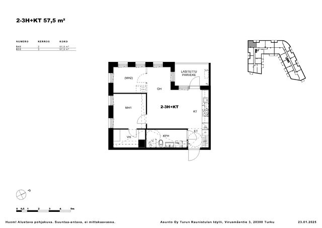 Etusivu / Varsinais-Suomi / Turku / Konsantie 1 1 / 1 Konsantie 1 Raunistula, Turku | Kerrostalo | 2-3h, avok, vh, kph, et, lasit.p 254 850 € Velaton hinta 57,5 m2 Asuinpinta-ala 224,25 €/kk Hoitovastike 2027 Rakennusvuosi HYÖDYNNÄ HUIPPUETU! Varaa asunto helposti ilman varausmaksua. Kauppakirjojen allekirjoituksen yhteydessä maksat myyntihinnasta vain 15 % ja loput vasta kodin valmistuessa (arvioitu valmistumisaika vuoden 2027 aikana).Raunistulan Idylli Modernia asumista Turun sydämessäRaunistulan Idylli yhdistää viehättävän puutaloalueen rauhan modernin asumisen mukavuuksiin. Asunnoissa on suuret ikkunat ja toimivat pohjaratkaisut. Tämä nelikerroksinen kerrostalo kohoaa Raunistulan sydämeen, vain lyhyen matkan päähän Turun keskustasta. Arvioitu valmistuminen vuoden 2027 aikana. Tämä valoisa ja näyttävä kulmakaksio tarjoaa sujuvaa arkea, ja sitä on mahdollista muokata juuri sinun tarpeisiisi sopivaksi. Voit lisätä kotiisi helposti yhden huoneen rakentamisen aikana tai sen jälkeen. Moderni ja selkeäpohjainen tila on helppo sisustaa juuri omien mieltymystesi mukaan. Olohuone yhdistyy luontevasti keittiöön luoden viihtyisän ja valoisan tilan yhdessäoloon tai rentoutumiseen pitkän päivän jälkeen. Erillinen eteistila lisää arjen sujuvuutta, ja järjestystä arkeen tuo makuuhuoneen yhteydessä sijaitseva iso vaatehuone. Suojaisa lasitettu parveke tuo lisätilaa ja toimii ympäri vuoden viihtyisänä oleskelupaikkana. Asunnossa on varaus viilentävälle ilmalämpöpumpulle. Idyllin asunnot sopivat niin yksinasuville, pariskunnille kuin pienille perheillekin. Tarjolla on myös muun muassa loft-tyylisiä koteja, joissa huonekorkeus kohoaa jopa neljään metriin ja nukkumaparvella on yli puolitoista metriä korkeutta. Ensimmäisen kerroksen asunnoissa on oma sisäänkäynti omalta pikkupihalta. Idyllissä arki sujuu ilman remonttihuolia tai pihatöitä. Taloyhtiöllä on vehreä ja viihtyisä piha, oma pihasauna, yhteinen kuntoilutila, pyörävarasto pesupaikkoineen sekä sähköautojen latausmahdollisuus. Asunnoissa on varaus ilmalämpöpumpulle ja taloyhtiössä varaudutaan aurinkopaneeleihin. Energiatehokkuus ja vastuulliset asumisratkaisut varmistavat kestävän ja miellyttävän asumisen.Raunistula on viehättävä puutalopainotteinen asuinalue vain 2 km päässä Turun keskustasta, rautatieasemalta ja Turun yliopistosta. Logomo sekä suunnitteilla oleva uusi Turun Ratapihan elämyskeskus ja areena tulevat sijaitsemaan vain kävelymatkan etäisyydellä.Kohde ennakkomarkkinoinnissa, kerromme mielellämme lisätietoja! Kohteen rakennuttamisesta vastaa SRV, joka on luotettava ja vakavarainen toimija. Myynti ja esittelyt/Miika Salmelap. 0500 533 582miika.salmela@bo.fijaSaija Palinp. 040 756 7070saija.palin@bo.fijaTAINA VUORIp. 050 527 4106taina.vuori@bo.fi Kiinnostaako tämä kohde?Ota meihin yhteyttä tai jätä viesti Miika Salmela asuntomyyjä, partner 0500 533 582 miika.salmela@bo.fi Tutustu välittäjään HuoneistoOsakkeet14386-14960HallintamuotoAsunto-osakeyhtiöHuoneluku2-3h, avok, vh, kph, et, lasit.pKerros/Kerroksia2/4Asuinpinta-ala57,5 m2Muut tilat0,0 m2Lisätietoja pinta-alastaPinta-ala ei ole tarkistusmitattuNäkymätHuoneistoilla on parvekkeet pohjapiirustusten mukaisesti. Lattia, katto ja seinät ovat betonirakenteisia. Parvekekaiteet ovat pääosin lasikaiteita. Asuntoparvekkeet ovat pääosin lasitettuja. Parvekkeet ovat ulkotiloja. Osassa parvekepielistä on asennettu varatieluukku, joka toimii poistumisreittinä hätätilanteessa. Osassa 1. kerroksen asunnoista on maantasoterassit. Maantasoterasseja ei lasiteta. Maantasoterasseilla on terassilaudoitus. ParvekeLasitettuHissiTaloyhtiössä on hissiKeittiön kuvaus, lisätiedot ja varustusKeittiökalusteiden ovet ja etusarjat ovat tehtaan vakiomallistoa. Kodinkoneet (Electrolux). KEITTOTASO: Induktiotaso 60 cm. KEITTOTASO: Induktiotaso 60 cm. KALUSTEUUNI: Teräs tai valkoinen 60 cm. MIKROAALTOUUNI: Valkoinen tai musta 60 cm. ASTIANPESUKONE: Astianpesukone 60 cm, kalustepeitteinen, ovi keittiön mukaan. JÄÄKAAPPI: Jääkaappi, vapaasti seisova, valkoinen/teräs. Kaappipakastin, vapaasti seisova, valkoinen/teräs. Jääkaappipakastin, vapaasti seisova, valkoinen/teräs. LIESIKUPU: Vallox Delico, valkoinen tai musta. KEITTIÖHANA: Oras Safira 1039F. PESUALLAS: Teräs tai musta, 40 tai 50 cm KEITTIÖN VÄLITILAVALAISIN: Kalustetoimittajan integroima LED-nauhavalaisin, 4000 K. Rakennuttajan puolelta on valmiiksi koottuna kolme eri tyylistä sisustusteemaa: Talvi, Kesä ja Syksy. Teemoja voi yhdistellä vapaasti keskenään. TALVI: KALUSTEOVI: Mattavalkoinen melamiiniovi. VEDIN: Yläovi, vetimetön. Alaovi ja korkeat komerot, RST lippavedin. KALUSTESOKKELI: Valkoinen, ei jalkalistaa keittiökalusteen eteen. TYÖTASO: Musta tai harmaa laminaattitaso. VÄLITILA: Valkoinen välitilalevy. KESÄ: KALUSTEOVI: Tammen sävyinen puukuvioinen melamiiniovi. VEDIN: Yläovi, vetimetön. Alaovi ja korkeat komerot, RST vedin. KALUSTESOKKELI: Valkoinen, ei jalkalistaa keittiökalusteen eteen. TYÖTASO: Marmorikuvioinen laminaattitaso. VÄLITILA: Valkoinen välitilalevy. SYKSY: KALUSTEOVI: Musta melamiiniovi, puusyykuvio. VEDIN: Yläovi, vetimetön. Alaovi ja korkeat komerot, messinkivedin. KALUSTESOKKELI: Valkoinen, ei jalkalistaa keittiökalusteen eteen. TYÖTASO: Marmorikuvioinen laminaattitaso.Pesutilojen kuvaus, lisätiedot ja varustusPesuhuoneessa on pyykinpesukoneliitäntä, varaus pesutornille, allas, allaskaluste ja sen yläpuolella valaisinpeilikaappi. Kalusteet ovat kalustelevyä. Suihkuseinä on pohjapiirrokseen merkityssä kohdassa. Suihkuseinien mitoitus on huoneistokohtaisten märkätilakaavioiden mukaan. Laatat: Laattapiste. PEILIKAAPPI: Svedbergs valkoinen peilikaappi LED-valolla 60 cm tai 80 cm. ALLAS JA ALLASKALUSTE: Svedbergs valkoinen posliiniallas ja valkoinen allaskaappi kahdella laatikolla 60 cm tai 80 cm. PESUALLASHANA: Oras Safira ECO 1012F-105, kromi, bidetta käsisuihkulla. SUIHKUHAN