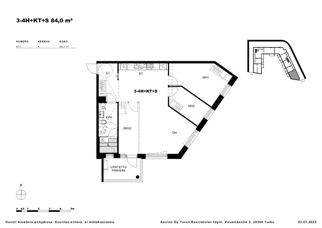 Etusivu / Varsinais-Suomi / Turku / Konsantie 1 1 / 1 Konsantie 1 Raunistula, Turku | Kerrostalo | 3-4h, avok, kph, s, et, lasit.p 354 900 € Velaton hinta 84,0 m2 Asuinpinta-ala 327,60 €/kk Hoitovastike 2027 Rakennusvuosi HYÖDYNNÄ HUIPPUETU! Varaa asunto helposti ilman varausmaksua. Kauppakirjojen allekirjoituksen yhteydessä maksat myyntihinnasta vain 15 % ja loput vasta kodin valmistuessa (arvioitu valmistumisaika vuoden 2027 aikana).Raunistulan Idylli Modernia asumista Turun sydämessäRaunistulan Idylli yhdistää viehättävän puutaloalueen rauhan modernin asumisen mukavuuksiin. Asunnoissa on suuret ikkunat ja toimivat pohjaratkaisut. Tämä nelikerroksinen kerrostalo kohoaa Raunistulan sydämeen, vain lyhyen matkan päähän Turun keskustasta. Arvioitu valmistuminen vuoden 2027 aikana. Tämä ylimmän kerroksen näyttävä huoneisto tarjoaa loistavan mahdollisuuden loihtia kodistasi juuri sinun tarpeisiisi sopivan. Voit lisätä kotiisi helposti yhden huoneen rakentamisen aikana tai sen jälkeen. Toimivassa pohjaratkaisussa olohuone yhdistyy luontevasti keittiöön luoden viihtyisän ja valoisan tilan yhdessäoloon tai rentoutumiseen pitkän päivän jälkeen. Erillinen eteistila lisää arjen sujuvuutta, ja kaartuvat ja persoonalliset muodot tekevät jokaisesta tilasta mielenkiintoisen. Etelään avautuva lasitettu parveke toimii ympäri vuoden viihtyisänä oleskelupaikkana. Ikkunallisessa saunassa voit rentoutua ja ladata akkuja pitkän päivän jälkeen. Asunnossa on varaus viilentävälle ilmalämpöpumpulle.Idyllin asunnot sopivat niin yksinasuville, pariskunnille kuin pienille perheillekin. Tarjolla on myös muun muassa loft-tyylisiä koteja, joissa huonekorkeus kohoaa jopa neljään metriin ja nukkumaparvella on yli puolitoista metriä korkeutta. Ensimmäisen kerroksen asunnoissa on oma sisäänkäynti omalta pikkupihalta. Idyllissä arki sujuu ilman remonttihuolia tai pihatöitä. Taloyhtiöllä on vehreä ja viihtyisä piha, oma pihasauna, yhteinen kuntoilutila, pyörävarasto pesupaikkoineen sekä sähköautojen latausmahdollisuus. Asunnoissa on varaus ilmalämpöpumpulle ja taloyhtiössä varaudutaan aurinkopaneeleihin. Energiatehokkuus ja vastuulliset asumisratkaisut varmistavat kestävän ja miellyttävän asumisen.Raunistula on viehättävä puutalopainotteinen asuinalue vain 2 km päässä Turun keskustasta, rautatieasemalta ja Turun yliopistosta. Logomo sekä suunnitteilla oleva uusi Turun Ratapihan elämyskeskus ja areena tulevat sijaitsemaan vain kävelymatkan etäisyydellä.Kohde ennakkomarkkinoinnissa, kerromme mielellämme lisätietoja! Kohteen rakennuttamisesta vastaa SRV, joka on luotettava ja vakavarainen toimija. Myynti ja esittelyt/Miika Salmelap. 0500 533 582miika.salmela@bo.fijaSaija Palinp. 040 756 7070saija.palin@bo.fijaTAINA VUORIp. 050 527 4106taina.vuori@bo.fi Kiinnostaako tämä kohde?Ota meihin yhteyttä tai jätä viesti Miika Salmela asuntomyyjä, partner 0500 533 582 miika.salmela@bo.fi Tutustu välittäjään HuoneistoOsakkeet30381-31220HallintamuotoAsunto-osakeyhtiöHuoneluku3-4h, avok, kph, s, et, lasit.pKerros/Kerroksia4/4Asuinpinta-ala84,0 m2Muut tilat0,0 m2Lisätietoja pinta-alastaPinta-ala ei ole tarkistusmitattuNäkymätHuoneistoilla on parvekkeet pohjapiirustusten mukaisesti. Lattia, katto ja seinät ovat betonirakenteisia. Parvekekaiteet ovat pääosin lasikaiteita. Asuntoparvekkeet ovat pääosin lasitettuja. Parvekkeet ovat ulkotiloja. Osassa parvekepielistä on asennettu varatieluukku, joka toimii poistumisreittinä hätätilanteessa. Osassa 1. kerroksen asunnoista on maantasoterassit. Maantasoterasseja ei lasiteta. Maantasoterasseilla on terassilaudoitus. ParvekeLasitettuHissiTaloyhtiössä on hissiKeittiön kuvaus, lisätiedot ja varustusKeittiökalusteiden ovet ja etusarjat ovat tehtaan vakiomallistoa. Kodinkoneet (Electrolux). KEITTOTASO: Induktiotaso 60 cm. KEITTOTASO: Induktiotaso 60 cm. KALUSTEUUNI: Teräs tai valkoinen 60 cm. MIKROAALTOUUNI: Valkoinen tai musta 60 cm. ASTIANPESUKONE: Astianpesukone 60 cm, kalustepeitteinen, ovi keittiön mukaan. JÄÄKAAPPI: Jääkaappi, vapaasti seisova, valkoinen/teräs. Kaappipakastin, vapaasti seisova, valkoinen/teräs. Jääkaappipakastin, vapaasti seisova, valkoinen/teräs. LIESIKUPU: Vallox Delico, valkoinen tai musta. KEITTIÖHANA: Oras Safira 1039F. PESUALLAS: Teräs tai musta, 40 tai 50 cm KEITTIÖN VÄLITILAVALAISIN: Kalustetoimittajan integroima LED-nauhavalaisin, 4000 K. Rakennuttajan puolelta on valmiiksi koottuna kolme eri tyylistä sisustusteemaa: Talvi, Kesä ja Syksy. Teemoja voi yhdistellä vapaasti keskenään. TALVI: KALUSTEOVI: Mattavalkoinen melamiiniovi. VEDIN: Yläovi, vetimetön. Alaovi ja korkeat komerot, RST lippavedin. KALUSTESOKKELI: Valkoinen, ei jalkalistaa keittiökalusteen eteen. TYÖTASO: Musta tai harmaa laminaattitaso. VÄLITILA: Valkoinen välitilalevy. KESÄ: KALUSTEOVI: Tammen sävyinen puukuvioinen melamiiniovi. VEDIN: Yläovi, vetimetön. Alaovi ja korkeat komerot, RST vedin. KALUSTESOKKELI: Valkoinen, ei jalkalistaa keittiökalusteen eteen. TYÖTASO: Marmorikuvioinen laminaattitaso. VÄLITILA: Valkoinen välitilalevy. SYKSY: KALUSTEOVI: Musta melamiiniovi, puusyykuvio. VEDIN: Yläovi, vetimetön. Alaovi ja korkeat komerot, messinkivedin. KALUSTESOKKELI: Valkoinen, ei jalkalistaa keittiökalusteen eteen. TYÖTASO: Marmorikuvioinen laminaattitaso.Pesutilojen kuvaus, lisätiedot ja varustusPesuhuoneessa on pyykinpesukoneliitäntä, varaus pesutornille, allas, allaskaluste ja sen yläpuolella valaisinpeilikaappi. Kalusteet ovat kalustelevyä. Suihkuseinä on pohjapiirrokseen merkityssä kohdassa. Suihkuseinien mitoitus on huoneistokohtaisten märkätilakaavioiden mukaan. Laatat: Laattapiste. PEILIKAAPPI: Svedbergs valkoinen peilikaappi LED-valolla 60 cm tai 80 cm. ALLAS JA ALLASKALUSTE: Svedbergs valkoinen posliiniallas ja valkoinen allaskaappi kahdella laatikolla 60 cm tai 80 cm. PESUALLASHANA: Oras Safira ECO 1012F-105, kromi, bidetta käsisu