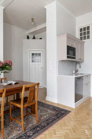 Etusivu / Uusimaa / Helsinki / Luotsikatu 4 1 / 1 Luotsikatu 4 Katajanokka, Helsinki | Kerrostalo | 3h, k, 2 x kph, parveke (Yj: 3 h+k) 1 220 000 € Velaton hinta 136,0 m2 Asuinpinta-ala 737,00 €/kk Hoitovastike 1906 Rakennusvuosi Katajanokan jugendhelmi - teille, jotka haluatte vähän enemmän!Tove Janssonin puistikosta on vain pieni kävelymatka tähän kauniiseen arkkitehti Gustaf Estlanderin suunnittelemaan taloon, jossa Tove asui elämänsä ensimmäiset vuodet. Komean ympäristön linnamaiset rakennukset ovat innoittaneet monia taiteilijoita, ja esim. Hugo Simbergin ateljee sijaitsi tässä samassa rakennuksessa. Nyt on uusilla asukkailla mahdollisuus inspiroitua ihanista 1900-luvun vaihteen yksityiskohdista ja samalla nauttia moderneista mukavuuksista. Viidennessä kerroksessa sijaitseva asunto yhdistää alkuperäisen arkkitehtuurin hienostuneen karisman ja modernin, korkeatasoisen remontin saumattomasti. Täällä yksityiskohdat eivät ole vain koristeita ne kertovat tarinaa. Kolmen huoneen, keittiön ja kahden kylpyhuoneen kokonaisuus tarjoaa väljyyttä ja käytännöllisyyttä ilman kompromisseja. Keittiö on suunniteltu oikeaan käyttöön: selkeälinjainen, laadukas ja inspiroiva. Olohuoneessa ja päämakuuhuoneessa komeilevat, arvokkaat ja käyttökunnossa olevat kakluunit aidot tunnelmanluojat, jotka tuovat kotiin lämpöä ja luonnetta.Parveke tuo lisätilaa ja näkymät kaupungin ylle antavat arkeen uudenlaista perspektiiviä ja sieltä avautuvat viehättävät kattonäkymät paikka, jonne tekee mieli palata.Yhtiössä on tehty merkittäviä kunnostuksia harkiten ja rakennuksen luonnetta kunnioittaen. Hissittömyys unohtuu nopeasti, kun pääset osaksi rakennuksen ainutlaatuista henkeä. Talon ylimmässä kerroksessa sijaitsee viihtyisä ja suosittu saunaosasto.Sijainti ei kaipaa korulauseita: kaikki Helsingin keskustan palvelut, ravintolat ja kulttuuritarjonta ovat kirjaimellisesti kulman takana. Liikenneyhteydet pelaavat, mutta kaikki tärkein on jo lähellä.Tämä koti on harvinainen tilaisuus ei pelkkä asunto, vaan osa kaupungin kerroksellista historiaa. Parhaiten tutustut tähän ihastuttavaan, eleganttiin kotiin varaamalla itsellesi esittelyajan - takaamme, että ihastut!Myynti/Sales/FörsäljningVirpi Romu040 0610 018virpi@bo.fi Kiinnostaako tämä kohde?Ota meihin yhteyttä tai jätä viesti Virpi Romu myyntijohtaja Ullanlinna, kiinteistönvälittäjä LKV, partner 040 061 0018 virpi@bo.fi Tutustu välittäjään Varaa aika kalenteristani HuoneistoOsakkeet19051-20390HallintamuotoAsunto-osakeyhtiöHuoneluku3h, k, 2 x kph, parveke (Yj: 3 h+k)Kerros/Kerroksia5/6Asuinpinta-ala136,0 m2Muut tilat0,0 m2Lisätietoja pinta-alastaHuoneistopinta-ala tarkistusmitattu laserkeilauksella ennen linjasaneerausta 2023. B15 huoneistopinta-ala nousi 134 m2 -> 136 m2. Yhtiöjärjestyksen ja isännöitsijäntodistuksen mukainen pinta ala on 134 m2. Tarkistusmitattu.NäkymätLäpitalon asunto: Näkymät etelään rauhalliselle sisäpihalle sekä pohjoiseen Luotsikadulle.ParvekeUlostyönnettyParvekkeen ilmansuuntaEteläKeittiön kuvaus, lisätiedot ja varustusKunto erinomainen. Kaapistot ja työtasot teetetty Jalokalusteen puusepillä. Kaapistot umpipuuta (runko koivua, pinnat saarnia) ja tammilaatikot sormiliitoksin. Työtasot kulutusta kestävää kvartsia. Lofran Dolce Vita 90cm leveä kaasuhella ja tuplasähköuunit. Lofran Dolce Vita side-by-side jääkaappi-pakastin jääpalakoneella. Keittiössä alkuperäinen helmipaneelikatto. Keittiössä on tunnelmaa luomassa Jotulin kamina, jossa on huippuimuri. Arman hana ulosvedettävällä juoksuputkella,Tapwell. Liesituuletin Lofra Dolce Vita 90 cm. Kattolamput: Heiden plafondit messinkiä. - Tiili/kiviseinät työtasojen takana. Pesutilojen kuvaus, lisätiedot ja varustus2023 linjasaaneerauksen yhteydessä uudet laatoitukset, italialainen seinälaatta Exalt Fairy White 60*120 cm. Jalokalusteen mittatilauskaapistot umpikoivua, pesutasot Carreran kiillotettua marmoria. Kääntyvä Hans Grohen Raindance kääntyvä sadesuihku ja Westerbergs-täysmittainen kylpyamme. Villeroy & Boch pesuallas. Pyyhekuivain. Himmennettävät 1920-luvun tyyliset kattovalaisimet Bovey plafondi, kromi. Longford- seinävalaisimet.Kylpyhuoneen varustusLattialämmitysWC-tilojen kuvausVictoria metrokaakeli, kaapit Jalokalusteen umpikoivua, allastaso Carreran kiillotettua marmoria. Jalokalusteen mittatilauskaapistot umpikoivua, pesutasot Carreran kiillotettua marmoria. Villeroy & Boch pesuallas. Kiertovesilämmitteinen pyyhekuivain. Kattovalaisimet Byström, kromattu messinki. Varustus: lattialämmitysLukumäärä: 1Saunan kuvaus, lisätiedot ja varustusTalohtiön sauna, jossa suojaisa parveke ullakolla.Makuuhuoneen kuvaus, lisätiedot ja varustusPäämakuuhuone: Tunnelmallinen ja iso makuuhuone. Louis ja Eva Mannerheim-Sparren piirtämä toimiva kaakeliuuni, alkuperäinen pyökkiparketti. Kaunis kaarellinen ruutuikkuna Luotsikadulle. Helsingön valaistu Ensiö-vaatekaappi. Toinen makuuhuone: Kauniit kaarikoristeet, alkovi. Valoisat ja avarat näkymät talon sisäpihalle. Helsingön valaistu Ensiö-kaappi.Lukumäärä: 2Lattiamateriaalit: parkettiSeinämateriaalit: kivi, maalattuOleskelutilojen kuvaus, lisätiedot ja varustusTilava ja tunnelmallinen olohuone toimivalla kaakeliuunilla. Alkuperäinen pyökkiparketti. Nurkkaerkkeristä upeat näkymät Tove Janssonin puistoon.Lattiamateriaalit: parkettiSeinämateriaalit: kivi, maalattuSeinämateriaalitAlkuperäiset seinät, kantavat seinät massiivitiilestä.LattiamateriaalitTammi- ja pyökkiparketti.KattomateriaalitKattopaneeli.Muuta kauppaan kuuluvaaEteisen iso vaatekaappi.Muutostyöt huoneistossaKeittiön ja kylpyhuoneiden täydellinen uusiminen linjasaneerauksen yhteydessä 2023. Makuuhuoneeseen muurattu taloyhtiössä ollut alkuperäinen Jugend- kaakeliuuni. Seinäpinnat maalattu 2023 - 2024 hallissa, keittiössä ja toisessa makuuhuoneessa sekä keittiön ja toisen makuuhuoneen lattia lakattu sekä ikkunapu