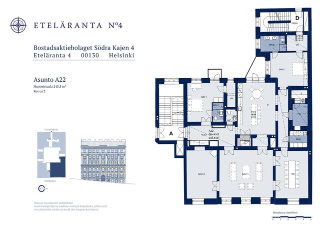 Etusivu / Uusimaa / Helsinki / Eteläranta 4 1 / 1 Eteläranta 4 Kaartinkaupunki, Helsinki | Kerrostalo | 6h, k, 3 x kph, s, khh, vh, wc + 2 parveketta 4 660 000 € Velaton hinta 245,5 m2 Asuinpinta-ala 1 522,10 €/kk Hoitovastike 1896 Rakennusvuosi Historiallinen arvoasunto merinäkymillä Kaartinkaupunki, EtelärantaNyt myynnissä ainutlaatuinen koti, jossa yhdistyvät arvokas historia, huippuluokan saneeraus ja Helsingin kehittyvimmän rantavyöhykkeen sijainti.Tämä edustuskoti sijaitsee arkkitehti Waldemar Aspelinin suunnittelemassa, vuonna 1896 valmistuneessa rakennuksessa, joka on juuri saatu valmiiksi laajamittaisesta saneerauksesta. Koko kiinteistö on palautettu alkuperäiseen arvoonsa, tinkimättä modernin asumisen vaatimuksista.Arvohuoneiston yksityiskohdat Upeat merinäkymät viidestä suuresta kaari-ikkunasta Etelärannan suuntaan Toinen kerros, mutta korkealla Kaksi parveketta rauhalliselle sisäpihalle Hulppea huonekorkeus, kauniit kipsilistat ja kattorosetit Laadukkaista keittiöistään tunnetun italialaisen Scavolinin valmistama keittiö, Mielen kodinkoneet Harmoninen värimaailma ja laadukkaat materiaalit Moderni talotekniikka, vesikiertoinen lattialämmitys ja viilennys (kaukojäähdytys) sekä koneellinen ilmanvaihto Kaksi sisäänkäyntiä mahdollisuus eriyttää edustus- tai työtilatSijainti, joka paranee vuosi vuodeltaAsunto sijaitsee Kaartinkaupungin Etelärannassa, alueella joka on parhaillaan suuressa muutoksessa. Helsingin kaupunki uudistaa Eteläsataman aluetta kunnianhimoisesti: satamatoiminnot siirtyvät ja tilalle rakentuu kaupunkilaisille avoin, merellinen olohuone, joka yhdistää taiteen, kulttuurin, kaupunkivihreän ja tapahtumat.Tulevaisuudessa tämä ympäristö tarjoaa asukkaille viihtyisän kävelyalueen, uuden arkkitehtuuri- ja designmuseon sekä perheystävällisiä palveluita, jotka nostavat alueen houkuttelevuutta entisestään.Bostadsaktiebolaget Södra Kajen 4 sijaitsee omalla tontilla arvostetussa kaupunginosassa vain muutaman askeleen päässä Esplanadilta ja kauppatorilta.Tervetuloa tutustumaan tähän poikkeukselliseen kotiin varaa oma yksityisesittelysi jo tänään.Tiedustelut ja esittelyt - Förfrågningar och bokning av visning Inquiries and booking of viewings:Sebastian Rostedt+358 400 373 620sebastian@bo.fi Kiinnostaako tämä kohde?Ota meihin yhteyttä tai jätä viesti Sebastian Rostedt partneryrittäjä, Fastighetsfamiljen LKV Ab 0400 373 620 sebastian@bo.fi Tutustu välittäjään HuoneistoOsakkeet2601-5055HallintamuotoAsunto-osakeyhtiöHuoneluku6h, k, 3 x kph, s, khh, vh, wc + 2 parvekettaKerros/Kerroksia2/6Asuinpinta-ala245,5 m2Muut tilat0,0 m2Lisätietoja pinta-alasta Yhtiöjärjestyksen mukainen.NäkymätAvarat merinäkymät sekä sisäpihanäkymät.ParvekeUlostyönnettyHissiTaloyhtiössä on hissiKeittiön kuvaus, lisätiedot ja varustusUpea keittiö Scavolinin mallistosta. LiesiInduktioliesiKeittiön lattiamateriaaliParkettiKeittiön seinien materiaaliMaalattuPesutilojen kuvaus, lisätiedot ja varustusKylpyhuone saunaosastolla, sekä kaksi erillistä kylpyhuonetta. Yhteensä kolme kph.Kylpyhuoneen varustusLattialämmitys, suihkuKylpyhuoneen lattiamateriaaliLaattaWC-tilojen kuvausErillinen wc, sekä wc-istuin kahden kylpyhuoneen yhteydessä.Varustus: lattialämmitysLukumäärä: 3Lattiamateriaalit: laattaKodinhoitohuoneVarustus: pesukoneliitäntä, pesuallas, pyykkikaapit, pöytätasoLattiamateriaalit: laattaSaunan lattiamateriaaliLaattaMakuuhuoneen kuvaus, lisätiedot ja varustusLukumäärä: 4Lattiamateriaalit: parkettiSeinämateriaalit: maalattuOleskelutilojen kuvaus, lisätiedot ja varustusLattiamateriaalit: parkettiSeinämateriaalit: maalattuMuut säilytystilatKellarikomeroKuntoUusi Kiinteistö- ja yhtiötiedotYhtiön nimiBostadsaktiebolaget Södra Kajen 4Tontin omistusOmaTontin koko1 454,00 m2Käyttöönottovuosi1896RakennusmateriaaliTiiliKattotyyppiHarjakattoKatePeltiLämmitysjärjestelmäKauko, muuLisätietoja energiatodistuksestaKohteelle ei lain mukaan tarvita energiatodistusta.Tehdyt korjaukset ja remontitOsittainen peruskorjaus 2022-2025 rakennusluvan mukaisesti. Lisätty lattialämmitys ja asuntokohtaiset ilmanvaihtolaitteet, julkisivut korjattu, ullakko rakennettu asunnoiksi. Yhtiö liitetty kaukojäähdytysverkkoonAutotallit2Lunastusoikeus osakkaillaKylläMuut rajoituksetKts. yhtiöjärjestys 18 §: Asuinhuoneiston käyttö majoitus- tms. toimintaan. Yhtiön tiloissa, yleisissä tiloissa, yleisillä alueilla, varastoissa sekä parvekkeilla on tupakointi kielletty.Lainat25 715 331,84 €Kiinnitykset33 600 000,00 €IsännöitsijäIsännöintitoimisto Suomen Kiinteistöyhtymä Oy Rauli Pirinen Kauppatie 8 04300 TUUSULA KiinteistönhoitoHuoltoyhtiöYhtiön tilat ja varusteluSauna, kellarikomero, urheiluvälinevarasto, kaapeli-tv, huoneistokohtaiset varastot. Saunaosasto, pyörävarastot Muita tietojaLisätietoa kaavoituksestaAlueella kaavamuutoksia vireillä, Esim. Eteläranta ja Makasiiniranta sekä designmuseo. VapautuuSopimuksen mukaan AsumiskustannuksetHoitovastike1 522,10 €/kk (6,20 €/m2)Rahoitusvastike10 924,75 €/kk (44,50 €/m2)Yhtiövastike yhteensä12 446,85 €Vesi28,00 oma mittariSauna15,00 €Muut maksut / lisätietoa maksuistaVesimaksu on ennakko/hlö/kk, tasaus oman mittarin mukaisesti. HintaMyyntihinta3 058 704,54 € (12 459,08 €/m2)Velkaosuus1 601 295,46 € (6 522,59 €/m2)Velaton hinta4 660 000,00 € (18 981,67 €/m2)MaksutapaKäteinen. Sinua voisi kiinnostaa Asunnon hinta-arvio ja arviokäynti Asunnon hinta-arvio ja arviokäynti Mitä hinta-arvio maksaa tai miten arviokäyntiä varten kannattaa valmistautua? Katso vastauksemme usein kysyttyihin ky… Sneak Peek® Sneak Peek® Sneak Peek® -palvelumme on askeleen edellä! Löydä alueesi uusimmat ja upeimmat asunnot jo ennen kuin ne ilmestyvät as… Asuntovahti Asuntovahti Etsimässä uutta asuntoa? Aseta itsellesi Bo-asuntovahti. Saat tiedon heti, kun unelmiesi asunto tulee myyntiin. Bo Match Bo Match Kun asuntounelmat ja 