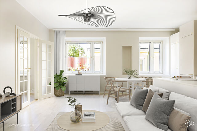 Etusivu / Uusimaa / Helsinki / Vuorimiehenkatu 14 1 / 1 Vuorimiehenkatu 14 Ullanlinna, Helsinki | Kerrostalo | 3h, avok, kph, wc, et (yj. 4 h+kk) 639 000 € Velaton hinta 73,0 m2 Asuinpinta-ala 248,20 €/kk Hoitovastike 1941 Rakennusvuosi Todella tyylikäs ja kaunis koti Ullanlinnan sydämessä. Tämä koti ihastuttaa jo sisään astuessa. Iso, valoisa ja avara olohuone yhdistyy tyylikkäästi vaaleaan, sopivasti moderniin, päivitettyyn avokeittiöön ja sen saarekkeeseen. Keittiö aamiaiskaappeineen sisältää paljon työ- ja säilytystilaa. Ikkunalaudat ovat leveät ja neliöitään isomman oloinen pohja antaa vaihtelumahdollisuuksia sisustukseen. Tilavat makuuhuoneet vaatekaappeineen sijaitsevat huoneiston molemmin puolin.Asunto sijaitsee hissitalon sisäpihan siivessä, josta ikkunat suuntaavat privaatisti kohti talon sisäpihaa sekä vinosti Tehtaankadun koulun pihaa päin. Kylpyhuone on mikrosementoitu moderniksi kauniiksi kokonaisuudeksi ja erillinen wc tuo sujuvuutta ja mukavuutta arkeen.Arkkitehti Eino Forsmanin (mm. Sibelius-akatemia) suunnittelema, funktionalismia edustava talo seisoo omalla tontillaan. Vuokratuloja sillä on mukavasti, n. 130 000 eur vuodessa, joten hoitovastike on pysynyt kohtuullisena, vain 3,40eur/m2/kk (248,20 eur).Hyvä, vakavarainen taloyhtiö, jossa korjauksia tehdään säännöllisesti ja suunnitelmallisesti. Taloyhtiö on velaton.Ullanlinnan idyllisen tyylikäs ympäristö ravintoloineen, putiikkeineen ja puistoineen sekä ydinkeskusta ja merenranta on juuri siinä, lähellä omaa kotiasi. Tehtaankadun ala-aste on talon vierellä. Ympäristö tulee todella hemmottelemaan Sinua palveluineen kantakaupungin sydämessä ja myös sen arvostetuimpiin kuuluvalla kadulla.Ihana koti Sinulle, joka arvostat tasokasta asumista, ja rauhallista huippusijaintia Etelä-Helsingissä. Pariskunnalle tai pienelle perheelle toimivuutta ja harmoniaa.Asunto on heti vapaa!Lämpimästi tervetuloa. Kiinnostaako tämä kohde?Ota meihin yhteyttä tai jätä viesti Juha Hakala kiinteistönvälittäjä LKV, partner 0400 482 854 juha.hakala@bo.fi Tutustu välittäjään Varaa aika kalenteristani HuoneistoOsakkeet112-115HallintamuotoAsunto-osakeyhtiöHuoneluku3h, avok, kph, wc, et (yj. 4 h+kk)Kerros/Kerroksia2/4Asuinpinta-ala73,0 m2Muut tilat0,0 m2Lisätietoja pinta-alastaPinta-alaa ei ole tarkistusmitattu. Mainittu pinta-ala saattaa tämän ikäisessä kohteessa (rakennettu ennen vuotta 1992) poiketa olennaisesti nykyisten standardien mukaan laskettavasta asuinpinta-alasta. Todellinen asuinpinta-ala voi tarkistusmittauksen jälkeen olla yhtiöjärjestyksessä, isännöitsijäntodistuksessa ja esitteessä mainittua pienempi tai suurempi. Yhtiöjärjestyksen mukainen. Isännöitsijäntodistuksen mukainen.NäkymätSisäpihalle ja Tehtaankadun koululle.HissiTaloyhtiössä on hissiKeittiön kuvaus, lisätiedot ja varustusKaunis avokeittiö, suurimmalta osin uusittu vuonna 2022. LiesiInduktioliesi, erillisuuniKeittiön lattiamateriaaliParkettiKeittiön seinien materiaaliMaalattuPesutilojen kuvaus, lisätiedot ja varustusLattia: mikrosementti Seinät: mikrosementtiKylpyhuoneen varustusPesukoneliitäntä, lattialämmitys, wc-istuin, suihkuWC-tilojen kuvausLavuaariseinä maalattu kaakelimaalilla v. 2022. Lukumäärä: 1Lattiamateriaalit: laattaSeinämateriaalit: kaakeliMakuuhuoneen kuvaus, lisätiedot ja varustusLukumäärä: 2Lattiamateriaalit: parkettiSeinämateriaalit: maalattuOleskelutilojen kuvaus, lisätiedot ja varustusLattiamateriaalit: parkettiSeinämateriaalit: maalattuMuuta kauppaan kuuluvaaEteisen kenkäkaappi, verhokiskot- ja tangot, sälekaihtimetMuutostyöt huoneistossaKylpyhuoneen laatoituksen pinnoitus mikrosementillä 28.11.2017 (aiempi omistaja). Vuonna 2022: pinnat, lattiat, lattialistat, seinät, katto, ikkunalaudat ja vanhat ovet kunnostettiin sekä lisättiin väliovi eteiseen. Keittiöön vaihdettiin ovet ja taso sekä lisättiin aamiaiskaappi ja vaihdettiin saareke. Yläkaapit poistettiin ja liesituuletin vaihdettiin. Jääkaappi ja keittiön hana uusittiin. Vesieriste laitettiin keittiön lavuaarin ja astianpesukoneen alle. Taloyhtiöltä haettiin ja saatiin lupa sekä hyväksyttiin yhtiön puolelta. Vuonna 2025 uusittiin lattiat parketiksiKuntoHyväLisätietoa kunnostaSiistikuntoinen, vuonna 2022 sekä 2025 päivitetty huoneisto. Kiinteistö- ja yhtiötiedotYhtiön nimiAsunto Oy Vuorimiehenkatu 14Tontin omistusOmaTontin koko1 753,00 m2Käyttöönottovuosi1941RakennusmateriaaliTiiliKattotyyppiHarjakattoKatePeltiLämmitysjärjestelmäKauko, muuEnergiatodistusKylläEnergialuokkaE2018Tehdyt korjaukset ja remontit2024 Viemäriputken hajoaminen vuonna 2024 (vaurioitti 4 asuntoa). Vahinko on saatu korjattua ja huoneistot ennallistettua. Hanke on saatu toteutettua alkuvuonna 2025. 2023 Takimmaisen porttikongin katon lämpöeristäminen 2020-22 Jäteaseman suunnittelu ja rakentaminen 2019 A-portaan hissin sähköistyksen uusinta. A-portaan seinämaalauksen ennallistaminen 2018 Pohjaviemärien uusinta näkyviltä osin, C-portaan hissin sähköistyksen uusinta 2017 C64 märkätilan kunnostus. Asuntojen ja liikehuoneistojen märkätilojen ja vesikalusteiden tarkastus. Autohallin varapoistumistien porraskuilun kunnostus. A-portaan hissin sähköistyksen / ohjauksen uusinta. 2016 Uusittu ullakon ikkunat. Viemäreiden tuuletusputkien jäätymissuojien asennus vesikatolle. Lukoston uudelleensarjoutus Abloy Sento-avaimelle. A-portaan hissin nostokoneisto uusittu. 2015 B-portaan hissin nostokoneisto uusittu ja hissikuilu maalattu. Kunnostettu B-portaan alatasanteen kattopinnoite. Asennettu lämmityksellä varustetut raitisilmaventtiilit liikehuoneistoihin. Toteutettu lämmityksen perussäätö, uusittu venttiilit ja järjestelmän ilmauskone. Laadittu lämpöjohtopiirrustukset ja suunniteltu lämmityksen perussäätö. Laadittu rakennuksen kuntoselvitys. 2014 C-portaan hissin nostokoneiston korjaus. Asuntojen ilmanvaihtokorjaus. Asennettu raitisilmaventtiilit asuntojen ukkuno