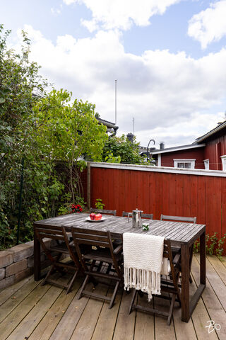 Etusivu / Uusimaa / Raasepori / Nahkurinkatu 5 b 1 / 1 Nahkurinkatu 5 b Tammisaari, Raasepori | Omakotitalo | 2h, avok, kph, parvi 398 000 € Velaton hinta 69,0 m2 Asuinpinta-ala 81,0 m2 Kokonaispinta-ala TÄTÄ KOTIA ESITELLÄÄN YKSITYISNÄTÖIN. OLETHAN YHTEYDESSÄ NIIN SOVITAAN JUURI SINULLE SOPIVA ESITTELYAIKA. Tunnelmallinen koti Tammisaaren vanhassakaupungissaTervetuloa ihastumaan tähän viehättävään ja huolella v 2022-2023 täysin remontoituun asuntoon, joka sijaitsee Tammisaaren vanhankaupungin sydämessä, merellisellä Nahkurinkadulla. Punamullattu rakennus henkii perinteistä rannikkokaupungin tunnelmaa. Täällä historia ja nykyaikainen mukavuus kohtaavat kauniisti.Valoisa ja avara asunto hurmaa vaaleilla sävyillään, korkealla katolla sekä kauniilla kattoparruilla, jotka kunnioittavat talon henkeä ja tuovat tilaan luonnetta.Tyylikkäästi toteutettu keittiö tarjoaa runsaasti säilytystilaa ja laadukkaat kodinkoneet. Kylpyhuone on raikas ja moderni. Olohuoneen kamina tuo tilaan lämpöä ja tunnelmaa, ja viereisiä tikkaita pitkin pääset parvelle, jossa on nukkumapaikat jopa neljälle. Makuuhuoneeseen mahtuu parisänky, ja se sijaitsee sisäpihan puolella.Sähkönkulutusta on saatu optimoitua energiatehokkaalla ilmalämpöpumpulla, sekä vesikiertoisella lattialämmityksellä, jota voi ohjata etänä. Myös kamina lämmittää mukavasti, etenkin syksyllä ja talvella. Pihan terassi kutsuu nauttimaan kesäpäivistä ja illoista, vaikka grillailun merkeissä. Merenranta, satama ja vanhankaupungin idylliset kujat kahviloineen ja putiikkeineen ovat vain kävelymatkan päässä.Tämä koti on paikka, jossa on helppo viihtyä ympäri vuoden.Trivsamt hem i Ekenäs gamla stanVälkommen till en smakfullt totalrenoverad bostad (20222023) i hjärtat av Ekenäs gamla stan, på lugna och havsnära Garvaregatan. Bostaden är ljus och rymlig med högt i tak och synliga takbjälkar som ger rummet karaktär. De ljusa ytorna skapar en lugn helhet.Köket är modernt och funktionellt med gott om förvaring och bra utrustning. Badrummet är fräscht och praktiskt. I vardagsrummet finns en eldstad som bidrar med värme och stämning. Från rummet leder en trappa upp till ett loft med plats för t.o.m fyra sovplatser. Sovrummet ligger mot innergården och rymmer en dubbelsäng.Bostaden har moderna uppvärmningslösningar, inklusive luftvärmepump och vattenburen golvvärme som kan styras på distans.Gårdens terrass ger möjligheten att njuta av sommarens dagar. Havet, småbåtshamnen och gamla stadens gränder med caféer och butiker finns inom bekvämt gångavstånd.Christoffer Hintze 0456686737christoffer@bo.fiIG@toffehintze Betjäning även på Svenska / Service also in English Kiinnostaako tämä kohde?Ota meihin yhteyttä tai jätä viesti Christoffer Hintze asuntomyyjä, partner 045 668 6737 christoffer@bo.fi Tutustu välittäjään Varaa aika kalenteristani RakennusRakennusmateriaaliHirsiKattotyyppiHarjakattoKatePeltiKaton kuntoHyväAsuinpinta-ala69,0 m2 (81,0 m2)Lisätietoja pinta-alastaEi tarkistusmitattu. Pinta-ala tieto saatu hallinnanjakosopimuksesta. Muut tilat n.12m2 on parvi.Kerrokset1Muut tilat12,0 m2Lämmitysjärjestelmän kuvausSähkö, ilmalämpöpumppuLämmön jakotapaVesikiertoinen lattialämmitys, ilmalämpöpumppuHuoneluku2h, avok, kph, parviKeittiön muut varusteetMikroaaltouuni, astianpesukone, liesituuletin / hormiLiesiInduktioliesiKeittiön työtasojen materiaaliPuuKylpyhuoneen varustusSuihkuseinä, wc-istuin, suihku, peilikaappi, peili, kylpyhuonekaapisto, asennettuja erikoisvarusteitaKylpyhuoneen lattiamateriaaliLaattaKylpyhuoneen seinämateriaaliKaakeliMakuuhuoneen kuvaus, lisätiedot ja varustusLukumäärä: 1Lattiamateriaalit: lautaSeinämateriaalit: tapetti, puolipaneeliOleskelutilojen kuvaus, lisätiedot ja varustusLattiamateriaalit: lautaSeinämateriaalit: tapetti, puolipaneeliTakkatiedotTakkaTehdyt korjauksetAsunto on remontoitu vuonna 2021/2022. Myyjän antamien tietojen mukaan seuraavat muutostyöt on tehty. Kaikki sisäpinnat ml. rossipohja sekä sisäkatto on purettu. Raaka-ullakko on otettu käyttöön. Kiinteistöön on vedetty uusi päävesiputki Nahkurinkadulta ja asennettu oma vesimittari. Jätevesiputket ovat myös uusittu. Sähköt on uusittu koko kiinteistössä. Uusi rossipohja ja lattia koko asunnossa ja kylpyhuoneeseen valettu uusi betonipohja. Eteisessä uudet laatat ja kylpyhuoneesa uudet laatat ja kaakelit. Lattiaan asennettu vesikiertoinen lattialämmitys koko asuntoon. Keittiö siirretty ja uusittu. Eteisessä uudet ikkunat ja uusi ulko-ovi sekä parvelle uusi ikkuna. Eristeet ja sisäpinnat uudistettu koko asunnossa. Lämmön tasapainottamiseksi lisätty ILP ja kamiina (2023). Uudet kaapistot koko asunnossa. Ulkopuolella uusittu pihapiiri. Ulkopuolelta maalattu koko talo. Myös meriportti ja meriportin käytävä maalattu. Yläkaton/välikaton tuuletusta parannettu harjatuulettimilla sekä tuuletusaukoilla. Kohteen kuvausOsapuolet vastaavat kukin itse hallitsemansa alueen kunnossapidosta, hoidosta, huollosta ja mahdollisesta rakentamisesta. Osapuolten tulee pitää hallitsemansa alueet niillä olevine rakennuksineen siisteinä ja viranomaismääräysten mukaisina. Jokainen osapuoli huolehtii tarpeen mukaan oman alueensa lumenajosta, hiekoituksesta, ruohonleikkuusta ja vastaavista hoitotoimenpiteistä. Talolla on suojelumerkintä SR ja luokitus: rakennus, jolla on ratkaiseva tai olennainen merkitys alueen yleisen historiallisen ja arkkitehtonisen arvon säilyttämiselle. Rakennusta ei saa purkaa tai muutoin hävittää.KuntoHyväLisätietoa kunnostaAsunto täysin remontoitu vuonna 2021/2022. KiinteistötiedotKiinteistötunnus710-2-15-9TyyppiMääräosaTontin tyyppiTasamaatonttiTontin koko150,00 m2Tontin omistusOmaRasitukset ja rasitteet1 kpl sähköinen panttikirja, siirretään ostajalle lainoittamattomana, sähköisen panttikirjan siirtokulu ostajalle. Lisätietoja tontistaKoko kiinteistön pinta-ala on 923m2. VesijohtoKunnan