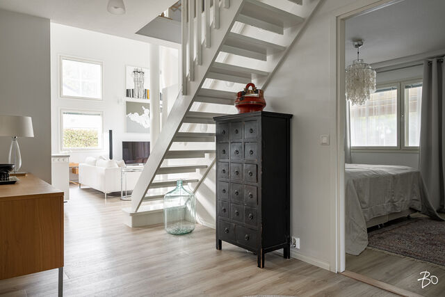 Etusivu / Pohjois-Pohjanmaa / Oulu / Kalikkakuja 10 1 / 1 Kalikkakuja 10 Kuivasjärvi, Oulu | Omakotitalo | 6h, k, aula, kph, khh, 2 x wc, lasitettu terassi 315 000 € Velaton hinta 185,0 m2 Asuinpinta-ala m2 Kokonaispinta-ala 1992 Rakennusvuosi Harvoin tarjolla! Upea kokonaisuus halutulta Kuivasjärven pientaloalueelta päättyvän tien varrelta vapautumassa ensimmäiseltä omistajalta.Tässä kodissa on kaikki viimeisen päälle! Keittiössä kivitasot, integroidut kodinkoneet ja hyvin lasku- ja kaappitilaa. Välitila on toteutettu venetsialaisella stucco-pinnoitteella, jota on käytetty myös eteisen ja alakerran wc:n lattioissa ja seinissä sekä olohuoneen, ala-aulan ja työhuoneen seinissä. Tähän arkkitehdin piirtämässä uniikkiin taloon suorastaan tulvii valoa sen suurista ikkunoista. Kylpyhuoneesta löytyvät tuplasuihkut, kylpyamme ja sauna, jonka kiukaassa myös höyrytoiminto. Kylpyhuoneesta kulku lasitetulle terassille, jossa vilvoittelet löylyjen jälkeen vuodenajasta riippumatta, sillä tila lämpeää lattialämmityksellä.Rapatuin sandwich -betonielementein rakennettu talo on säntillisesti pidetty ja lokakuussa 2025 kuntotarkastettu. Sähkölämmitystä ovat tukemassa ilmalämpöpumppu kahdella sisäyksiköllä sekä varaava takka. Sähköauton latauspiste asennettu autokatokseen vuonna 2024.Kävelyetäisyydeltä löytyvät niin lähikauppa, koulu, päiväkoti, leikki- ja koirapuisto kuin loistavat ulkoilumahdollisuudetkin. Yliopisto ja Ideaparkin kattavat palvelut vain lyhyen ajomatkan päässä.Ota yhtyettä ja sovi oma esittelyaikasi jo tänään!Nelli Hänninenkiinteistönvälittäjä LKV, partner050 323 2300nelli.hanninen@bo.fi Kiinnostaako tämä kohde?Ota meihin yhteyttä tai jätä viesti Nelli Hänninen kiinteistönvälittäjä LKV, partner 050 323 2300 nelli.hanninen@bo.fi Tutustu välittäjään Varaa aika kalenteristani RakennusRakennusvuosi (aloitettu)1991Käyttöönottovuosi1992RakennusmateriaaliElementti, betoniKattotyyppiHarjakattoKateTiilikateAsuinpinta-ala185,0 m2Lisätietoja pinta-alastaRakennusvalvonnan mukaan huoneistoala on 185 m2 ja kerrosala on 229 m2.Kerrokset2Muut tilat0,0 m2Lämmitysjärjestelmän kuvausSähköLämmön jakotapaSähköpatterilämmitys, sähköinen lattialämmitys, sähköinen kattolämmitys, uuni/takka, ilmalämpöpumppuHuoneluku6h, k, aula, kph, khh, 2 x wc, lasitettu terassiKeittiön kuvaus, lisätiedot ja varustusKeittiö remontoitu vuonna 2014. Välitilassa Stucco -pinnoite.Keittiön muut varusteetMikroaaltouuni, astianpesukone, kiinteät valaisimet, liesituuletin / hormiLiesiInduktioliesi, erillisuuniKeittiön työtasojen materiaaliKiviKeittiön lattiamateriaaliVinyyliKeittiön seinien materiaaliMaalattu, muuPesutilojen kuvaus, lisätiedot ja varustusKylpyhuone remontoitu vuonna 2000.Kylpyhuoneen varustusKylpyamme, suihkuseinä, lattialämmitys, wc-istuin, suihku, peilikaappi, kiinteät valaisimetKylpyhuoneen lattiamateriaaliLaattaKylpyhuoneen seinämateriaaliKaakeliSaunaAsunnossa on saunaSaunan kuvaus, lisätiedot ja varustusSauna remontoitu vuonna 2000. Höyrykiuas.Saunan lattiamateriaaliLaattaSaunan seinämateriaaliPuuWC-tilojen kuvausAlakerran wc:n seinä- ja lattiapinnat Stucco -pinnoitetta.Lukumäärä: 2Lattiamateriaalit: laattaSeinämateriaalit: kaakeliKodinhoitohuoneVarustus: pesukoneliitäntä, pesuallas, lattialämmitys, lattiakaivoLattiamateriaalit: laattaSeinämateriaalit: maalattuMakuuhuoneen kuvaus, lisätiedot ja varustusLukumäärä: 5Lattiamateriaalit: lauta, korkki, vinyyliSeinämateriaalit: maalattu, lasikuitutapettiOleskelutilojen kuvaus, lisätiedot ja varustusVenetsialaista stucco -pinnoitetta käytetty olohuoneen, keittiön, ala-aulan sekä alakerran työ/makuuhuoneen seinissä.Lattiamateriaalit: vinyyliSeinämateriaalit: maalattuTulisijaVaraava takkaTakkatiedotMuuTehdyt korjaukset1999 Yläkerran lisähuonelaajennus (loppukatselmus suoritettu), 2000 Lasitus ja lattialämmitys kuistille (loppukatselmus suoritettu), 2000 Kylpyhuone ja sauna remontoitu, 2014 Keittiön, olohuoneen, eteisen ja alakerran vessan seinien tasoitus ja laastipinnoitus, alakerran lattian vaihto vinyylilankkuun, eteisen ja wc lattia Stucco, tuulikaapin liukuovikaapisto, 2014 Keittiöremontti, 2016 Tiilikaton pinnoitus ja jiirien huolto, 2020 Ilmalämpöpumppu kahdella sisäyksiköllä (Mitsubishi), 2024 Sähköauton latausasema (Zaptec), 2025 Valokuituyhteys (Valokuitunen), Hormit nuohottu vuosittain, viimeksi kesällä 2025KuntoHyväEnergiatodistusKylläEnergialuokkaD2018 KiinteistötiedotKiinteistötunnus564-81-145-3-L1TyyppiOmakotitaloTontin tyyppiTasamaatonttiTontin koko864,00 m2Tontin omistusVuokrattuTontin vuokrasopimus päättyy31.12.2045Tontin vuokra481,71 €Tontin vuokraajaOulun KaupunkiLisätietoja tontistaTie perilleVesijohtoKunnanViemäriKunnanRakennusoikeus, e-luku0.25 AsumiskustannuksetKiinteistövero479,20 €Muut maksut / lisätietoa maksuistaValokuitunen liittymämaksu 9,90€/kk. Lämmitys- ja käyttösähkö ollut yhteensä n. 25 500 kwh / vuosi. HintaVelaton hinta315 000,00 €Myyntihinta315 000,00 € VapautuuHetiMaksuehtoKäteinen. Sinua voisi kiinnostaa Asunnon hinta-arvio ja arviokäynti Asunnon hinta-arvio ja arviokäynti Mitä hinta-arvio maksaa tai miten arviokäyntiä varten kannattaa valmistautua? Katso vastauksemme usein kysyttyihin ky… Sneak Peek® Sneak Peek® Sneak Peek® -palvelumme on askeleen edellä! Löydä alueesi uusimmat ja upeimmat asunnot jo ennen kuin ne ilmestyvät as… Asuntovahti Asuntovahti Etsimässä uutta asuntoa? Aseta itsellesi Bo-asuntovahti. Saat tiedon heti, kun unelmiesi asunto tulee myyntiin. Bo Match Bo Match Kun asuntounelmat ja unelmien asunnot kohtaavat, syntyy Bo Match. Tutustu uudenlaiseen tapaan käydä asuntokauppaa.