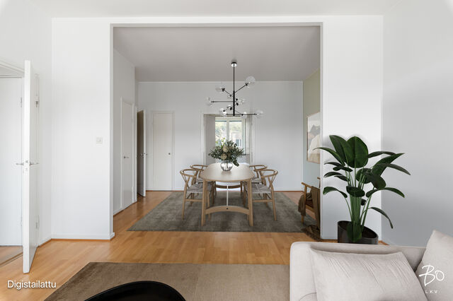 Etusivu / Uusimaa / Helsinki / Mannerheimintie 19 1 / 1 Mannerheimintie 19 Töölö, Helsinki | Kerrostalo | 4h, k, kph, erill. wc, parveke (yj: 4h+k+kph+wc+parveke) 595 000 € Velaton hinta 94,0 m2 Asuinpinta-ala 423,00 €/kk Hoitovastike 1937 Rakennusvuosi Mainio perheasunto 93 m2 Olympiastadionin ja kisahallin tuntumassaTässä hyvin hoidetun yhtiön 4. kerroksen läpitalon huoneistossa on hyvä pohjaratkaisu ja sen näkymät ja tunnelma on aivan fantastinen. Olohuoneesta, piianhuoneesta sekä keittiöstä avautuu upeat näkymät raitiovaunuvarikon yli pitkälle taka- Töölöön. Takapihan puolella olevista kahdesta makuuhuoneesta ja parvekkeelta on näkymä avaralle ja hiljaiselle korttelipihalle. Olohuone ja halli muodostavat toimivan ja avaran kokonaisuuden. Olohuoneessa on hieno erkkeri ja suuri ikkuna, mikä tekee siitä hyvin valoisan. Tyylikäs parketti viimeistelee kokonaisuuden. Erillinen kylpyhuone ja wc on toimiva ja hyvä ratkaisu. Molemmat on uusittu viimeksi vuonna 2004 tehdyn LVIS-saneerauksen yhteydessä. Keittiössä on puukuvioiset ja puurimoituksella somistetut ovet ja laminaattitasot. Keittiö on ikääntynyt ja sen kunnostamisen kannattaa varautua. Huoneisto on muilta osin varsin siistissä kunnossa. Seinäpinnat on pääosin maalatut, katto on juuri verkotettu lasikuituverkolla ja tasoitettu ja maalattu koko asunnon osalta. Reilun kokoisessa päämakuuhuoneessa on hyvin tilaa parisängylle ja vaatekaapistoille. Tilaa jää myös muille kalusteille tai vaikkapa työpisteelle. Toinenkin makuuhuone on reilun kokoinen ja sijaitsee myös pihan puolella.Taloyhtiön sisäpihalla on yhdeksän autopaikkaa, joita voi vuokrata jonotusperiaatteella. Yhtiöllä on sen omistamista liiketiloista lähes 100.000 euron vuosittaiset tulot, mikä pitää vastikkeen maltillisena. Tämän asunnon sijainti on erinomainen. Töölön Kulttuuri- ja liikuntapalvelut ovat vieressä ja Töölön alueen kauppa- ja ravintolapalvelut ovat lähistöllä. Ulkoilun ystäville sijainti on mitä mainioin, voit lähteä joko reippailemaan Töölönlahden ympäri kauniisiin rantamaisemiin tai suunnata keskuspuistoa pitkin upeille metsäreiteille. Tervetuloa ihastumaan tähän näyttävään Töölöläiskotiin.Yhteydenotot ja esitepyynnöt:Pekka Kujala, 040 832 8888, pekka@bo.fitaiRaya Virtanen, 040 820 7717, raya@bo.fiONKO ASUNNON MYYNTI AJANKOHTAISTA?Varaa minut alla olevan linkin kautta maksuttomalle arviokäynnille:https://bo.fi/henkilo/pekka-kujala/#kalenteri Kiinnostaako tämä kohde?Ota meihin yhteyttä tai jätä viesti Pekka Kujala kiinteistönvälittäjä LKV, partner 040 832 8888 pekka@bo.fi Tutustu välittäjään Varaa aika kalenteristani HuoneistoOsakkeet2483-2576HallintamuotoAsunto-osakeyhtiöHuoneluku4h, k, kph, erill. wc, parveke (yj: 4h+k+kph+wc+parveke)Kerros/Kerroksia4/6Asuinpinta-ala94,0 m2Muut tilat0,0 m2Lisätietoja pinta-alastaMainittu pinta-ala saattaa tämän ikäisessä kohteessa poiketa olennaisesti nykyisten standardien mukaan laskettavasta asuinpinta-alasta. Todellinen asuinpinta-ala voi olla yhtiöjärjestyksessä, isännöitsijäntodistuksessa ja esitteessä mainittua pienempi tai suurempi. Pinta-alaa ei ole tarkistusmitattu. Isännöitsijäntodistuksen mukainen. Yhtiöjärjestyksen mukainen.NäkymätOlohuoneesta, piianhuoneesta ja keittiöstä avarat maisemat länteen Mannerheimintien ja ratikkahallin yli pitkin Taka-Töölöä. Makuuhuoneista ja parvekkeelta näkymät n. koiliseen korttelipihalle. ParvekeUlostyönnettyParvekkeen ilmansuuntaKoillinenHissiTaloyhtiössä on hissiKeittiön kuvaus, lisätiedot ja varustusKeittiössä on puujäljitelmäkaapistot koristelistoineen, vaaleat laminaattitasot. Keittiö on ikääntynyt ja kaipaa kunnostamista. Lattiassa on linoleum-laattaa, seinä- ja kattopinnat ovat maalatut. Valoisasta keittiöstä on kauniit näkymät Taka-Töölön suuntaan.LiesiSähköliesiPesutilojen kuvaus, lisätiedot ja varustusKylpyhuoneen seinä- ja kattopinnat ovat kauttaaltaan laatoitetut, katto maalattu. Kylpyhuone on kunnostettu v. 2004 tehdyn LVIS-saneerauksen yhteydessä. Kylpyhuone on tilava ja sinne mahtuu suihkun ja allaskaapiston lisäksi myös pesukone. Kylpyhuoneen varustusPesukoneliitäntä, suihku, asennettuja erikoisvarusteitaKylpyhuoneen lattiamateriaaliLaattaKylpyhuoneen seinämateriaaliKaakeliWC-tilojen kuvausErillisen wc:n seinät ja lattiapinnat ovat keraamista laattaa, katto on maalattu. Varustus: bidee-suihkuLukumäärä: 1Lattiamateriaalit: laattaSeinämateriaalit: kaakeliMakuuhuoneen kuvaus, lisätiedot ja varustusKaksi makuuhuoneista sijaitsee talon takapihan puolella. Ikkunoista aukeaa kaunis korttelipihanäkymä. Toisessa makuuhuoneessa on parveke aamuauringon puolelle. Keittiön vieressä on lisäksi pieni palvelijan huone, joka sopii hienosti lastenhuoneeksi tai vaikkapa työhuoneeksi. Jos kaksi makuuhuonetta riittää, niin palvelijanhuoneen voi myös liittää keittiöön purkamalla yhden väliseinän. Yhden makuuhuoneen seinät ovat tapettia, kahden muun seinät ovat maalatut. Lukumäärä: 3Oleskelutilojen kuvaus, lisätiedot ja varustusOlohuone on tilava ja valoisa ja se yhdistyy ison oviaukon avulla viereiseen halliin, mikä tuo entisestään lisää tilaa ja avaruutta tähän asuntoon. Olohuoneesta on upeat näkymät Mannerheimintien ja viereisen Töölön raitiovaunuvarikon yli pitkälle Taka-Töölöön. Olohuoneen lattiat on parkettia ja seinät ja katto ovat maalatut. Katot on juuri verkotettu ja tasoitettu ja maalattu koko asunnossa.KuntoTyydyttävä Kiinteistö- ja yhtiötiedotYhtiön nimiAsunto Oy Mannerheimintie 19 Bostads AbTontin omistusOmaTontin koko924,00 m2Käyttöönottovuosi1937RakennusmateriaaliBetoniKattotyyppiHarjakattoKatePeltiLämmitysjärjestelmäKaukoEnergiatodistusKylläLisätietoja energiatodistuksestaRakennuksen laskennallinen energiatehokkuuden vertailuluku eli E-luku 135. Todistus voimassa 25.07.2034.EnergialuokkaD2018Tehdyt korjaukset ja remontit2024 Ikkunoiden kuntotutkimus, A-portaan