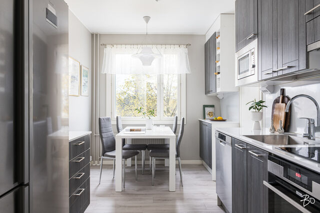 Etusivu / Pirkanmaa / Tampere / Amurinkatu 1 1 / 1 Amurinkatu 1 Amuri, Tampere | Kerrostalo | 2-3h, k, ph/wc, et, lasip. 298 000 € Velaton hinta 72,0 m2 Asuinpinta-ala 283,05 €/kk Hoitovastike 1970 Rakennusvuosi Aivan ihastuttavan kotoisa ja tilava kaksio (ollut 3h) on juuri tullut myyntiin, eikä varmaan myynnissä kauan vanhene. Tämän ihanan asunnon ikkunoista avautuu upeat näkymät, niin valoisalla kuin pimeälläkin, valaistun Näsinneulan sekä Näsijärven maisemiin.Kolmannessa kerroksessa sijaitsevasta kulma-asunnosta avautuu, hurmaavat kaupunkinäkymät länteen päin, sekä tunnelmalliset järvimaisemat pohjoisen suuntaan, jotka vaihtuvat vuodenaikojen mukaan.Asumismukavuutta lisää oma lasitettu parveke, josta voit kuunnella Ravintola Kaislan musiikkiesityksiä kesällä. Tässä hurmaavassa ja muuttovalmiissa muunneltavissa olevassa kodissa yhdistyvät romanttinen ja kodikas tyyli, jotka luovat rauhoittavan ja todella lämpimän ilmapiirin. Kauniisti remontoitu keittiö tarjoaa modernit puitteet kokkaamiselle, sekä sen, että keittiöön mahtuu myös ruokapöytä. Tässä huolella suunnitellussa pohjaratkaisussa on parasta se, että sitä on mahdollista muuttaa omien tarpeiden mukaan mm. ruokasalin voisi tehdä heti keittiötä vastapäätä olevaan tilaan ja sen päähän voisi laittaa lisää vitriinejä ym. säilytystilaa tai osasta olohuonetta voisi väliseinällä erottaa toisen ikkunallisen makuuhuoneen tai vaikka työhuoneen. Asunnon olohuone jäisi siltikin vielä reilunkokoiseksi. Asunnossa on tilava makuuhuone, jonka yhteydessä on isohko vaatehuone, sekä tietty sen ikkunasta voi ihailla Näsijärvi näkymää. Lisää säilytystilaa tarjoaa eteisen kiinteät kaapistot, sekä lämmin verkkovarasto. Hyvin hoidettu taloyhtiö sijaitsee omalla tontilla, jonka piha-alue on vehreä ja huoliteltu. Taloyhtiö on pysynyt ajan tasalla monien kunnostuksien ansiosta, josta mainittakoon vuonna 2015 tehty taloteknisten järjestelmien ja märkätilojen saneeraus. Hulppeilla näkymillä varustettu yhtiön saunaosasto ja sen vilvoittelu parveke on asukkaiden nautittavissa maksua vastaan ja sauna vuoron varaamalla. Amurin kaupunginosa tarjoaa asukkailleen rauhallisen ja puistomaisen ympäristön, joka houkuttelee asukkaita vauvasta vaariin. Alueen arvostettu maine ja sen monipuoliset palvelut tekevät siitä suositun asuinpaikan. Lähettyviltä löytyvät hyvämaineiset koulut ja päiväkodit sekä erinomaiset liikenneyhteydet kaupungin keskustaan. Lähipuistoissa on loistavat mahdollisuudet ulkoiluun ja rentoutumiseen, mikä lisää alueen viehätysvoimaa entisestään.Tämä hurmaava koti kutsuu sinut tutustumaan siihen paikan päälle ja kokemaan itse kaikki sen tarjoamat edut. Ota rohkeasti yhteyttä ja varaa oma yksityinen esittelysi!Myyntiä hoitaa:Jaana Sippola ylempi kiinteistönvälittäjä YKV, LKV044 9700 868jaana.sippola@bo.fiOlipa kyseessä ensimmäinen asuntokauppasi tai seuraava suuri askeleesi, minä olen täällä auttamassa sinua yli 20 vuoden kokemuksella, tarjoten asiantuntevaa ja henkilökohtaista palvelua, juuri sinun tarpeidesi mukaan. Kun aika on, niin olethan rohkeasti yhteydessä minuun. Kiinnostaako tämä kohde?Ota meihin yhteyttä tai jätä viesti Jaana Sippola ylempi kiinteistönvälittäjä YKV, LKV, partner 044 970 0868 jaana.sippola@bo.fi Tutustu välittäjään Varaa aika kalenteristani HuoneistoOsakkeet4150-4704HallintamuotoAsunto-osakeyhtiöHuoneluku2-3h, k, ph/wc, et, lasip. Kerros/Kerroksia3/10Asuinpinta-ala72,0 m2Muut tilat0,0 m2Lisätietoja pinta-alastaYhtiön huoneistojen pinta-aloja ei ole tarkistusmitattu, tämän vuoksi pinta-alat saattavat poiketa olennaisestikin nykystandardien mukaan laskettavasta huoneistoalasta. Huoneiston todellinen asuinpinta-ala voi siten olla yhtiöjärjestyksessä ja esitteessä ilmoitettua suurempi tai pienempi. Hinta ei ole pinta-ala perusteinen. Yhtiöjärjestyksen mukaan huoneisto käsittää: 3h+k+parv Isännöitsijäntodistuksen mukainen. Yhtiöjärjestyksen mukainen.NäkymätOlohuone, parveke, keittiö, pesuhuone ja makuuhuone pohjoiseen, josta näkymä Näsijärven suuntaan ja Särkänniemeen. Olohuoneen toinen ikkuna (mahdollisen toisen makuuhuoneen) ikkuna länteen Amurinkadulle. ParvekeLasitettuParvekkeen ilmansuuntaPohjoinenHissiTaloyhtiössä on hissiKeittiön kuvaus, lisätiedot ja varustusTyylikäs keittiö uusittu vuonna 2021 ja sen varustus on: jääkaappi/pakastin ja jää/viileäkaappi, induktioliesi, erillisuuni (rosteri), liesituuletin (suodatin), integroitu mikro, astianpesukone (rosteri). Kaapistot: harmaa mdf. Seinillä: maali ja lattiassa vilyylilankku. Keittiön työtasojen materiaaliKiviPesutilojen kuvaus, lisätiedot ja varustusVarustus: ikkuna, rättipatteri, 2 x peilikaappi, suihkuseinä, suihku, wc, bidee, 2 x käsienpesuallas ja allaskaapistot, pesukoneliitäntä. Kylpyhuoneen lattiamateriaaliLaattaKylpyhuoneen seinämateriaaliKaakeliMakuuhuoneen kuvaus, lisätiedot ja varustus1-2 mh. Lattiassa vinyylilankku ja seinillä tapetti ja maali. Oleskelutilojen kuvaus, lisätiedot ja varustusLattiassa vinyylilankku ja seinillä tapetti ja maali. Muutostyöt huoneistossaKeittiö remontoitu kokonaan vuonna 2021. Asunnon pintaremontti vuonna 2021 mm. lattiat uusittu, listat ja seinät ja katot. KuntoHyvä Kiinteistö- ja yhtiötiedotYhtiön nimiAsunto Oy Kortelahdenkatu 2Tontin omistusOmaTontin koko2 427,00 m2Käyttöönottovuosi1970RakennusmateriaaliBetoniKattotyyppiTasakattoKateHuopakateLämmitysjärjestelmäKaukoEnergiatodistusKylläLisätietoja energiatodistuksestaE-luku: 160, voimassa 25.11.2034 saakka. EnergialuokkaD2018Tehdyt korjaukset ja remontit- 2025 Bauer vedenkäsittelylaitteet lämmitys- ja käyttövesiverkkoon - 2024-2025 Talouskellarin purku ja muuttaminen pyörävarastokäyttöön - 2024 Tukikahvat rappukäytävään huoneisto-ovien viereen (Lännen Korjauspalvelu Oy) - 2023 Ikkunoiden tuloilmaventtiilien uusinta - 2022 Selvitys sähköautojen latauksesta - 2020 Tu
