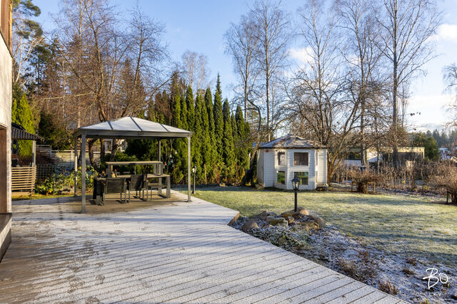 Etusivu / Uusimaa / Espoo / Pirttikuja 8 1 / 1 Pirttikuja 8 Tillinmäki, Espoo | Erillistalo | 4-5 h, k, kph, s, ph, wc, khh, th, var., viherh., parvekeYj mukaan 4-5 h+k+autotalli 555 000 € Velaton hinta 150,0 m2 Asuinpinta-ala 176,0 m2 Kokonaispinta-ala 1988 Rakennusvuosi Kaksitasoinen erillistalo isolla pihalla Tillinmäessä.Tervetuloa tutustumaan kotiin, joka hurmaa jo ensiaskeleista lähtien! Espoon halutulla Tillinmäen pientaloalueella sijaitseva kaksitasoinen erillistalo tarjoaa modernia asumismukavuutta rauhallisen puutarhamiljöön keskellä täydellisen yhdistelmän arjen helppoutta ja kodikasta tunnelmaa.Suurista, moneen suuntaan olevista ikkunoista tulviva luonnonvalo tekee jokaisesta huoneesta avaran ja kutsuvan. Kodin huoneet muuntautuvat helposti perheen tarpeiden mukaan, ja huoneiden toimivuus tukee niin arjen askareita kuin etätyöpäivien sujuvuutta. Tyylikäs keittiö tarjoaa loistavat puitteet kokkailuun ja yhdessäoloon, ja laadukas saunaosasto kruunaa kiireisen päivän. Illan hämärtyessä voit vetäytyä tilavaan viherhuoneeseen nauttimaan omasta rauhasta lämpölamppujen alla vaikka ympäri vuoden.Vuonna 1988 rakennettu, hyvin hoidettu talo luo turvalliset ja huolettomat puitteet asumiselle. Vehreä piha kutsuu viettämään aikaa ulkona: oleskelualueet sopivat niin rentoon kahvihetkeen kuin lasten leikkeihin, joita piristää pihan suloinen leikkimökki. Kauniisti hoidettu ympäristö tekee pihasta kodin sydämen, jossa viihtyy koko perhe.Tillinmäen asuinalue hurmaa rauhallisuudellaan ja perheystävällisyydellään. Lähikoulut, päiväkodit ja ulkoilureitit löytyvät läheltä, ja sujuvat yhteydet Espoon sekä koko pääkaupunkiseudun palveluihin tekevät arjesta vaivatonta. Kaikki tarvittava on lähellä mutta silti täällä asutaan omassa rauhassaan.Tule paikan päälle ja anna tämän kodin valloittaa sinut saatat löytää unelmiesi kodin juuri täältä.Kysy lisätietoja ja sovi yksityisesittely:Raya Virtanen, 040 820 77 17, raya@bo.fitai Pekka Kujala, 040 832 88 88, pekka@bo.fiONKO ASUNNON MYYNTI AJANKOHTAISTA?Varaa minut alla olevan linkin kautta maksuttomalle arviokäynnille:https://bo.fi/henkilo/raya-virtanen/#kalenteri Kiinnostaako tämä kohde?Ota meihin yhteyttä tai jätä viesti Raya Virtanen ylempi kiinteistönvälittäjä YKV, LKV, KiLAT, kaupanvahvistaja, partner 040 820 7717 raya@bo.fi Tutustu välittäjään Varaa aika kalenteristani HuoneistoOsakkeet13-24HallintamuotoAsunto-osakeyhtiöHuoneluku4-5 h, k, kph, s, ph, wc, khh, th, var., viherh., parvekeYj mukaan 4-5 h+k+autotalliKerros/Kerroksia1-2/2Asuinpinta-ala150,0 m2 (176,0 m2)Muut tilat26,0 m2Lisätietoja pinta-alastaYhtiöjärjestyksen ja isännöitsijäntodistuksen mukainen pinta-ala on 171+26 m2. Espoon kaupungin rakennus- ja huoneistorekisteriotteen mukaan asuinpinta-ala on 150 m2. Alakerrassa on lisäksi askarteluhuone ja aputiloja, yhteensä n. 26 m2. Lisäksi autotalli n. 22 m2 ja sen yhteydessä oleva lämmin varasto n. 8,8 m2. Yhtiön huoneistojen pinta-aloja ei ole tarkistusmitattu, tämän vuoksi pinta-alat saattavat poiketa olennaisestikin nykystandardien (SFS 5139) mukaan laskettavasta huoneistoalasta. Huoneiston todellinen asuinpinta-ala voi siten olla yhtiöjärjestyksessä ja esitteessä ilmoitettua suurempi tai pienempi. Erillistalo myydään kokonaisuutena, eikä kauppahinta ole sidottu huoneiston pinta-alaan. Halutessaan ostaja voi teettää tarkistusmittauksen oikean pinta-alatiedon varmistamiseksi. Yhtiöjärjestyksen mukainen.NäkymätPuutarhapihalleParvekeUlostyönnettyKeittiön kuvaus, lisätiedot ja varustusTilava keittiö, jossa runsaasti kaappi- ja työskentelytilaa. Valkoiset kaapistot, rosterinen uuni ja jääkaappi. Pakastin ja astianpesukone integroitu kaapistoon. Keittiössä on reilu tila myös ruokapöydälle erkkeri-ikkunan edessä.LiesiInduktioliesi, erillisuuniKeittiön työtasojen materiaaliLaminaattiKeittiön lattiamateriaaliLaminaattiKeittiön seinien materiaaliMaalattuPesutilojen kuvaus, lisätiedot ja varustusYläkerran kylpyhuoneessa suihku, wc-istuin, allaskaapisto, peilikaappi. Valkoiset seinäkaakelit ja vaalea harmaa laattalattia suihkussa tehostelaattaa. Kaapistot kauniit tammiset. Alakerrassa saunan pesuhuoneessa kaksi suihkua, vaaleat seinäkaakelit ja tuma lattialaatta. Kylpyhuoneen varustusSuihkuseinä, lattialämmitys, wc-istuin, suihku, peilikaappi, peili, kiinteät valaisimet, kylpyhuonekaapistoKylpyhuoneen lattiamateriaaliLaattaKylpyhuoneen seinämateriaaliKaakeliWC-tilojen kuvausAlakerrassa erillinen wc, talon toinen wc-istuin on yläkerran kylpyhuoneessa.Varustus: peilikaappi, bidee-suihkuLattiamateriaalit: laattaSeinämateriaalit: kaakeliKodinhoitohuoneReilun kokoinen kodinhoitohuone, hyvin laskutilaa ja kaappeja sekä avohyllyjä. Varustus: pesukoneliitäntä, pesuallas, lattialämmitys, lattiakaivo, pyykkikaapit, pöytätasoLattiamateriaalit: laattaSeinämateriaalit: maalattu, osalaatoitusSaunan kuvaus, lisätiedot ja varustusKaunis vaaleapuinen ikkunallinen sauna, Harvian pilarikiuas.Saunan lattiamateriaaliLaattaSaunan seinämateriaaliPuuMakuuhuoneen kuvaus, lisätiedot ja varustusYläkerrassa kaksi makuuhuonetta, alakerrassa kolme huonetta tällä hetkellä makuuhuonekäytössä.Lattiamateriaalit: laminaattiSeinämateriaalit: maalattuOleskelutilojen kuvaus, lisätiedot ja varustusKahteen suuntaan olevista ikkunoista tulvii päivän valoa sisään, olohuoneesta on käynti parvekkeelle. Olohuoneen vieressä upea ruokailutila erkkeri-ikkunoilla. Lattiamateriaalit: laminaattiSeinämateriaalit: maalattuMuut tilatAlakerrassa takkahuone ja varasto/tekninen tila, joka ollut perheellä käytössä myös työhuoneena. Lisäksi viherhuone, jonne käynti takkahuoneesta ja portaiden alla varastotilaa.Muut säilytystilatMuu erillinen varastoMuuta kauppaan kuuluvaaAlakerran makuuhuoneessa oleva kaapisto.Muutostyöt huoneistossaPintaremontti 2015-2016, Alakerta rakenteet, huonemuutokset ala- ja yläkerrassa. Sauna, ph, wc, kph, keitt