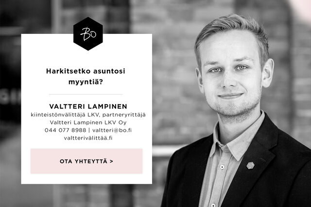 Etusivu / Pirkanmaa / Tampere / Hämeenpuisto 43-45 1 / 1 Hämeenpuisto 43-45 Hämeenpuisto, Tampere | Kerrostalo | 2h, k, kph/wc 285 000 € Velaton hinta 68,0 m2 Asuinpinta-ala 272,00 €/kk Hoitovastike 1963 Rakennusvuosi Hämeenpuistosta vapautumassa poikkeuksellisen tilava kaksio halutusta yhtiöstä!Tästä Hämeenpuiston eteläpäässä sijaitsevasta himoitusta talosta on vapautumassa harvinaisen tilava kaksio. Tilaa asunnossa on hulppeat 68 m². Avarat tilat ja suuret ikkunat kahdella suunnalla tekevät asunnosta poikkeuksellisen valoisan. Heti sisään astuessa avautuu eteen tilava olohuone. Eteisen yhteydestä on käynti tyylikkääseen kylpyhuoneeseen. Olohuoneen toiselle seinustalle jäävät keittiö sekä makuuhuone.Keittiössä on tilaa suurellekin ruokapöydälle. Keittiöstä löytyy erikoisuutena myös kaksi uunia, joista toinen toimii samalla mikroaaltouunina. Makuuhuoneen yksi seinusta on täysin liukuovikaapistoa, joten säilytystilaa on reilusti. Koko huoneisto on saneerattu laadukkaasti uuteen uskoon vuonna 2017.Tampereen keskustan kattavat palvelut, Ratinan kauppakeskus sekä tunnelmallinen Laukontori ovat kaikki vain kivenheiton päässä. Myös Pyynikin laajat lenkkeilymaastot lähtevät läheisestä Eteläpuistosta.As Oy Tiillispuisto on vuonna 1963 rakennettu omatonttinen yhtiö. Rakennus on Alvar Aallon oppipojan Erkki Luoman käsialaa. Tiilispuiston sanotaan olevan Tampereen viimeisimpiä paikallaan muurattuja tiilitaloja. Osakkaan käytössä on tilava kellarikomero. Myös autopaikkoja on yhtiöllä reilusti. Yhtiön upeasti saneeratut saunatilat löytyvät vinttikerroksesta.Varaa oma esittelysi vaikka heti!Kohdetta myy:Valtteri Lampinen | 044 0778988 | valtteri@bo.fi#valtterivälittääTiesithän että osaava ja aktiivinen välittäjä sekä laadukas brändi ja vaikuttava markkinointi ovat avainasemassa matkalla kohti onnistunutta asuntokauppaa. Kutsu minut maksuttomalle arviokäynnille, ja luodaan yhdessä paras mahdollinen suunnitelma juuri teidän kotinne myyntiin. Kiinnostaako tämä kohde?Ota meihin yhteyttä tai jätä viesti Valtteri Lampinen kiinteistönvälittäjä LKV, partneryrittäjä | Valtteri Lampinen LKV Oy 044 077 8988 valtteri@bo.fi Tutustu välittäjään Varaa aika kalenteristani HuoneistoOsakkeet34153-34592HallintamuotoAsunto-osakeyhtiöHuoneluku2h, k, kph/wcKerros/Kerroksia3/7Asuinpinta-ala68,0 m2Muut tilat0,0 m2Lisätietoja pinta-alastaPinta-alaa ei ole tarkistusmitattu. Isännöitsijäntodistuksen mukainen. Yhtiöjärjestyksen mukainen.HissiTaloyhtiössä on hissiKeittiön kuvaus, lisätiedot ja varustusKeittiö saneerattu vuonna 2017. Jääkaappi/pakastin LG, uuni AEG, integroitu mikroaaltouuni/uuni AEG, liesi (induktio) AEG, astianpesukone Miele, liesituuletin. Kaksi uunia.Keittiön työtasojen materiaaliPuuKeittiön lattiamateriaaliLaattaPesutilojen kuvaus, lisätiedot ja varustusKylpyhuone saneerattu vuonna 2017.Kylpyhuoneen varustusSuihkuseinä, pesukoneliitäntä, wc-istuin, suihku, peilikaappiKylpyhuoneen lattiamateriaaliLaattaKylpyhuoneen seinämateriaaliKaakeliMakuuhuoneen kuvaus, lisätiedot ja varustusLukumäärä: 1Kauppaan ei kuuluIrtainKuntoHyvä Kiinteistö- ja yhtiötiedotYhtiön nimiAsunto Oy TiilispuistoTontin omistusOmaTontin koko4 832,00 m2Käyttöönottovuosi1963RakennusmateriaaliTiiliKattotyyppiMonimuotoKateKupariLämmitysjärjestelmäMuuEnergiatodistusKylläEnergialuokkaF2013Tehdyt korjaukset ja remontit1992 ovipuhelimien asennus, 1994 käyttövesijohtojen uusiminen, 1994 lämmönjakolaitteiden uusiminen, 1994 ikkunapuitteiden maalaus, 1997 parvekkeiden kunnostus, 1999 kylmiön koneistus, 1999 rappukäytävien tasanteiden pinnoitus, 2002 pohjaviemäreiden uusiminen, 2002 pesulan koneiden uusiminen, 2006 terassirappauksen korjaus Hämeenpuiston puolelta, 2006 IV- kanavien puhdistus ja ilmanvaihdon säätö, 2006 hissien peruskunnostus, 2007 palo-ovien asentaminen vss-tilaan, 2007 Hämeenpuiston puoleisen julkisivun elementtisaumojen uusiminen, 2007 betoniaitojen korjausta, 2007 Hämeenpuiston puolen porrastasojen askelmakivien kunnostus, 2007 IV- tuloilmakoneen asennus autohalliin, 2007 katon huolto- ja korjauskartoitus, 2007 paloilmoitinkeskuksen uusiminen (autohalli) ja uuden asentaminen (vintti), 2008 betoniaidan kunnostus (Hämeenpuiston puoli), sisäpihan puuovien kunnostus, 2008 kulun rakentaminen kellarista autohalliin, 2008 patteriverkoston säätäminen, 2008, saunaosastojen (puuosat) ja vilpoloiden kunnostus, 2009 porraskäytävien maalaus, 2009 julkisivun rappauskorjaukset, 2009 Pihakalusteiden uusinta, 2011 sadevesisyöksyjen 3kpl sukitus, 2011 kiinteistön peruskuntoarvion laatiminen, 2011 lumiesteiden asentaminen sisäpihan puolelle, 2011 tiiliruukinkadun puoleisen aidan kunnostus, 2012 viemärisaneerauksen hankesuunnittelu, 2012 kunnostettiin taloyhtiön omistamat huoneistot B36 ja B37, 2012 kattoterassin vesieristeen korjaus ja parvekeoven uusiminen, 2013 liiketilan remontti ja ikkunoiden uusiminen, 2013 viemärin sukitussaneeraus, 2013 pihakannen rakenteen esiselvitys, 2013 A31 ikkunaseinän ja parvekeovien uusiminen, 2014 hankesuunnitelma, joka hyväksytty yhtiökokouksessa 11.11.2014, 2016-2017 Julkisivu- (ml. ikkunat), piha- ja saunaosastojen korjaus, syväkeräysastiat, 2017 lämmöntalteenottojärjestelmän ja maalämmön rakentaminen, kulkuväylien lämmitys Ilmanvaihtohormien puhdistus, autohallin nosto-oven lamellien vaihto, pelastus- ja turvallisuus suunnitelma laadittu, 2018 Ilmanvaihtojärjestelmän poistoventtiilien vaihto, mittaus ja säätö, Iloq-lukosto, liiketilaan uudet ovet sekä uudet julkisivun tammiovet, Kulkuväylien lämmityksen loppuunsaattaminen (B-, C-portaan edusta sekä eteläpääty), Elector-vedenkäsittelylaitteen asennus lämmitysjärjestelmään, paloilmoitinkeskuksen sekä autohallin paloilmoittiminen uusinta, 2019 tallentava kameravalvonta, porttikongin katon lisälämmöneristys, palovaroittimien asennus asuinhuoneistoihin, maahan upotettavien pollareiden as