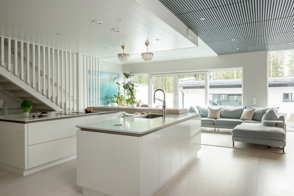 Nokian Sammalistosta vapautumassa erityisen tarkoin harkittu kokonaisuus omalla 1806m²:n tontilla! Tämä arkkitehdin suunnittelema vuonna 2016 valmistunut omakotitalo on ajaton kokonaisuus, jossa on yhdistetty estetiikka arjen toimivuuteen. Talon ja erillisen saunarakennuksen yhdistää tilava lasitettu terassi. Sisäänkäynnin yhteydessä on vaatesäilytystilaa sekä erillinen wc. Tähän päähän taloa jäävät myös kaksi makuuhuonetta, joista toinen toimii tällä hetkellä pukeutumishuoneena, sekä niiden väliin jäävä upea kylpyhuone. Amme on arvoisellaan paikalla kahden suuren ikkunan edessä, joista avautuu rauhallinen näkymä metsään. Kylpyhuoneessa on lisäksi kahdella malja-altaalla varustettu allaskaluste. Tilan kautta kuljetaan lisäksi erilliseen wc -tilaan sekä suihkuun. Kylpyhuoneen ja päämakuuhuoneen välissä on suuri ikkuna, joka tekee tilasta erityisen valoisan ja uniikin. Talossa on kauniit tammiviilupintaiset väliovet, jotka tuovat lämpöä ja kontrastia vaaleille pinnoille. Eteisen jälkeen tila avautuu avaraan ja valoisaan olohuoneeseen ja keittiöön. Tilan molemmin puolin olevat lattiasta kattoon yltävät ikkunat saavat huoneen kylpemään luonnonvalossa. Keittiön puolelta avautuu näkymä kauniille etupihalle ja olohuoneesta takapihan metsään. Upeaa A la Carte keittiötä hallitsee suuri saareke, jonka taso on massiivitammea. Muuten keittiössä on kivikomposiittitasot. Olohuoneen puolella on Conturan kiertoilmatakka. Lattioissa on tyylikäs Timberwisen tammiparketti. Olohuoneesta on käynti kauniiden puukehyksisten pariovien kautta kolmanteen makuuhuoneeseen, josta löytyy myös kaapistot. Keittiön kautta kuljetaan kodinhoitohuoneeseen ja sitä kautta lasitetulle terassille. Suuri lasitettu terassi on korkeaa tilaa ja yhdistää päärakennuksen kätevästi saunarakennukseen. Terassilta avautuu rauhoittavat näkymät takapihan metsään ja kulmauksessa on tunnelmallinen Jotulin valurautakamiina. Tilassa on lisäksi kaukosäätimellä toimiva infrapunalämmitin. Saunarakennuksesta löytyy sauna, suihkuhuone kahdella sadesuihkulla, erillinen wc sekä huone, joka taipuu kätevästi työhuoneeksi, harrastetilaksi, vierashuoneeksi tai vaikka makuuhuoneeksi omaa rauhaa kaipaavalle. Saunassa on puukiuas mutta myös varaus sähkökiukaalle. Kylpyhuoneiden laatoitukset on toteutettu laadukkailla, pääosin italialaisilla laatoilla. Sekä talossa että saunarakennuksessa on kiinnitetty erityistä huomiota myös valaistukseen ja sen toimivuuteen. Esimerkiksi tunnelmaa luovia epäsuoria valaistusratkaisuja on käytetty useissa tiloissa. Etupihalla on suuri terassialue. Terassit ovat Siperian lehtikuusta, joka onkin jo harmaantunut kauniisti. Terassilla on kaukosäätimellä toimiva markiisi sekä sähkövaraus porealtaalle. Lisäksi löytyy katos kahdelle autolle. Autokatoksen yhteydessä kaksi erillistä lämmintä varastoa. Talo lämpiää edullisesti ja ekologisesti maalämmöllä ja viilenee kesäisin maaviileällä kattokonvektorin kautta. Sähkönkulutus on ollut nykyisillä asukkailla vain 11 700 kwh/vuosi. Rakennusoikeuttakin on jäljellä 94m². Nokian Sammalisto on rauhallinen omakotitaloalue, johon on tullut viime vuosina paljon uutta asutusta. Kulkuyhteydet niin Nokian kuin Tampereenkin palveluiden ääreen ovat erinomaiset. Varaa oma esittelysi vaikka heti!