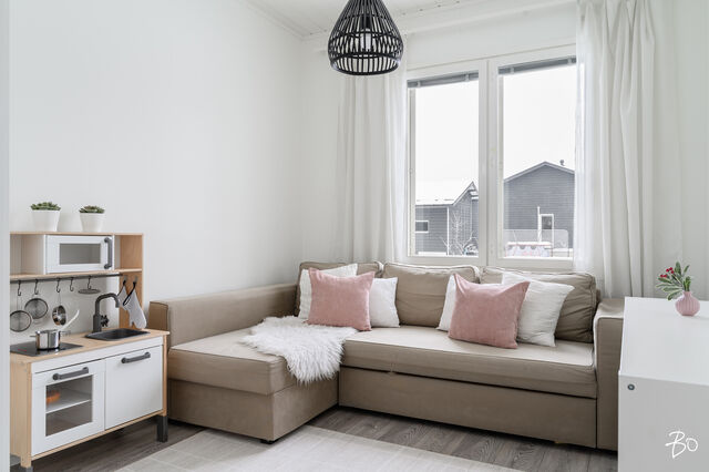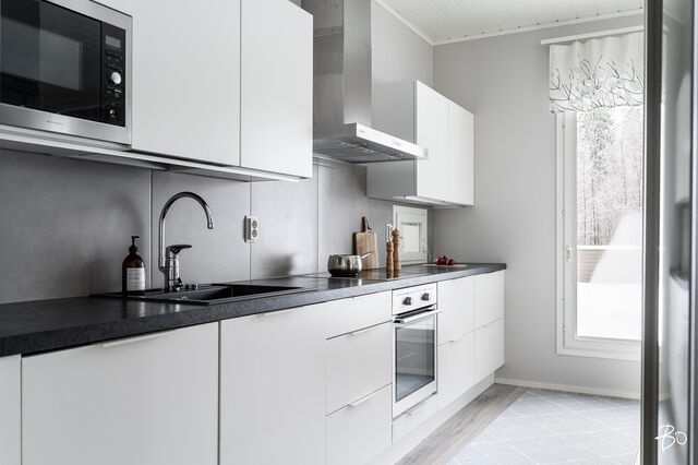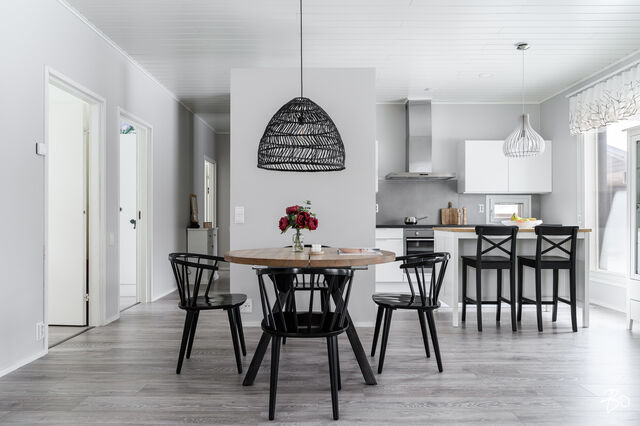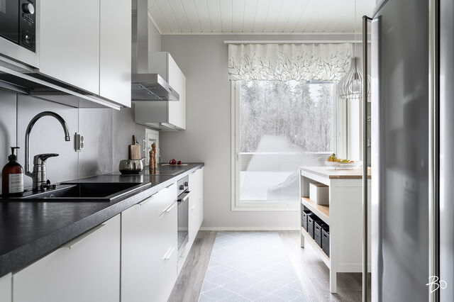 Olohuone sekä keittiö ovat avaraa yhtenäistä tilaa, josta on suurien ikkunoiden kautta rauhallinen näkymä pihan takana olevaan puistoalueeseen. Keittiössä oleva saareke antaa lisää lasku- ja säilytystilaa. Arki-eteisellä varustettu tilava kodinhoitohuone toimii mainiosti lapsien ja lemmikkien kanssa.