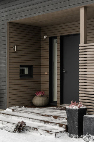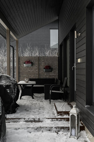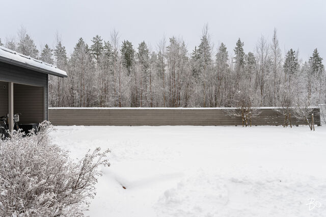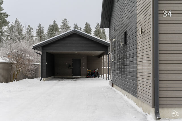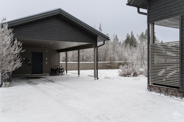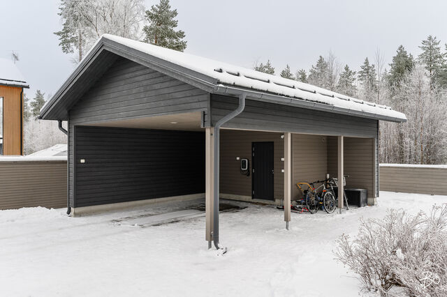 Talousrakennuksessa on kahdelle autolle katos sähköauton latausasemalla ja pyörien säilytyskatos sekä 8 neliöinen lämmin varasto.