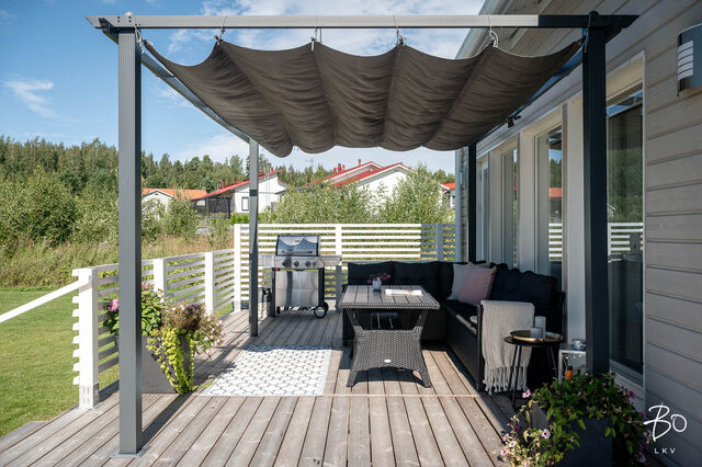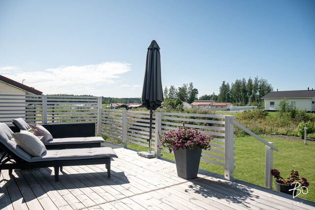 Olohuoneesta ja kodinhoitohuoneesta ja on kulku isolle koko talon levyiselle terassille, jossa on mukavaa vaikka vilvoitella saunan jälkeen. Terassilla on myös varaus porealtaalle, joten sen saa helposti halutessaan asennettua. Makuuhuoneita on kaikkiaan kolme ja päämakuuhuoneessa on tilava vaatehuone. Säilytystilaa löytyy hyvin myös eteisen vaatehuoneesta/varastosta.
